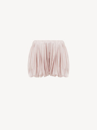 Fluid, gathered mini bloomer shorts in light silk charmeuse with a silk lining. PRODUCT DETAILS Bloomer shorts outer shell: 100% Silk Lining: 100% Silk Fit: fluid, mini length - The model is 5'10" (178 cm) and wears a prototype in size 36 - Fluid shorts - Left-side zipper - Side pockets Care: dry cleaning only This product was made in collaboration with Akanjo, a certified WFTO supplier. Akanjo is a social enterprise located in Madagascar that places equal pay and employees' health & wellbeing at the core of their priorities. A long-standing partner of Chloe for 15 years, Akanjo is also committed to training and promoting craftsmanship. Color: Pansy Pink Item code: CH25USH043296H5