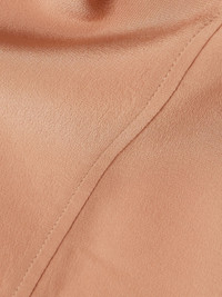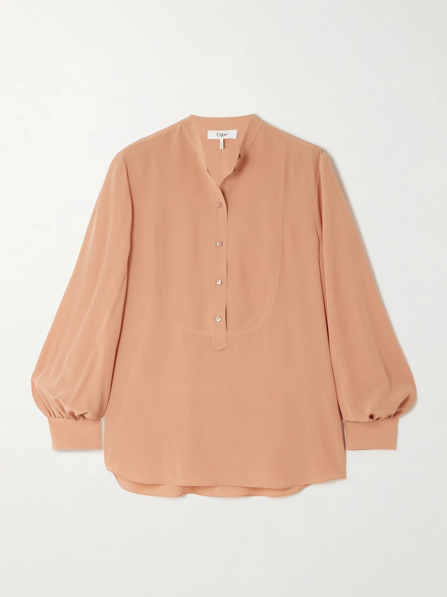 Chloe's blouse channels the effortless elegance of its Parisian roots. Cut from certified silk-crepe, it has lightly puffed sleeves, bib front and a grandad collar. Style yours with denim, tailored pants or leather – it works with everything. Lower-Impact Materials. This product is made using at least 50% lower-impact materials or ingredients. Find out more about our NET SUSTAIN criteria here. Size & Fit - Fits true to size, take your normal size - Cut for a slightly loose fit - Lightweight, semi-sheer, non-stretchy fabric - Model is 180cm/ 5'11" and is wearing a FR 36 Model measurements: - Bust: 80cm/ 31.5" - Waist: 65cm/ 25.5" - Hip: 89cm/ 35" Details & Care - Peach silk-crepe - Button fastenings along front - 100% silk - Dry clean - Mother-of-pearl: Australia