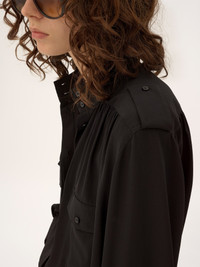 DESCRIPTION High-neck gathered blouse in organic silk crepe de chine, featuring flap pockets, shoulder tabs and mother-of-pearl buttons. PRODUCT DETAILS Gathered blouse outer shell: 100% Silk Buttons: 100% Mother-of-pearl Fit: fluid - The model is 5'10" (178 cm) and wears a prototype in size 36 - Silk blouse - Mother-of-pearl buttons - Buttoned shoulder tabs - Buttoned flap pockets Organic silk manufacturing restricts the use of pesticides, insecticides or harsh chemicals and incorporates methods that respect biodiversity, improve soil quality and reduce water consumption. This product was made in collaboration with Akanjo, a certified WFTO supplier. Akanjo is a social enterprise located in Madagascar that places equal pay and employees' health & wellbeing at the core of their priorities. A long-standing partner of Chloe for 15 years, Akanjo is also committed to training and promoting craftsmanship. Color: Black Item code: CH26SHT20005001 CARE INSTRUCTIONS To preserve the integrity of your garment, please refrain from washing, entrusting its care to professional cleaning services for optimal maintenance. This garment cannot withstand any bleaching agent. To maintain its shape, gently iron this garment at a maximum sole plate temperature of 110°C, taking care to avoid any harsh pressure while ironing. Entrust this garment to a specialist for mild cleaning with tetrachloroethylene and solvent F, ensuring its delicate nature is maintained with the most care. To best preserve its form and texture, please do not tumble dry this garment. To maintain its delicate nature, do not wet clean this garment. TRACEABILITY Better traceability is central to improving our materials as well as social and environmental practices. Dyeing: Italy Finishing: Italy Weaving: Italy