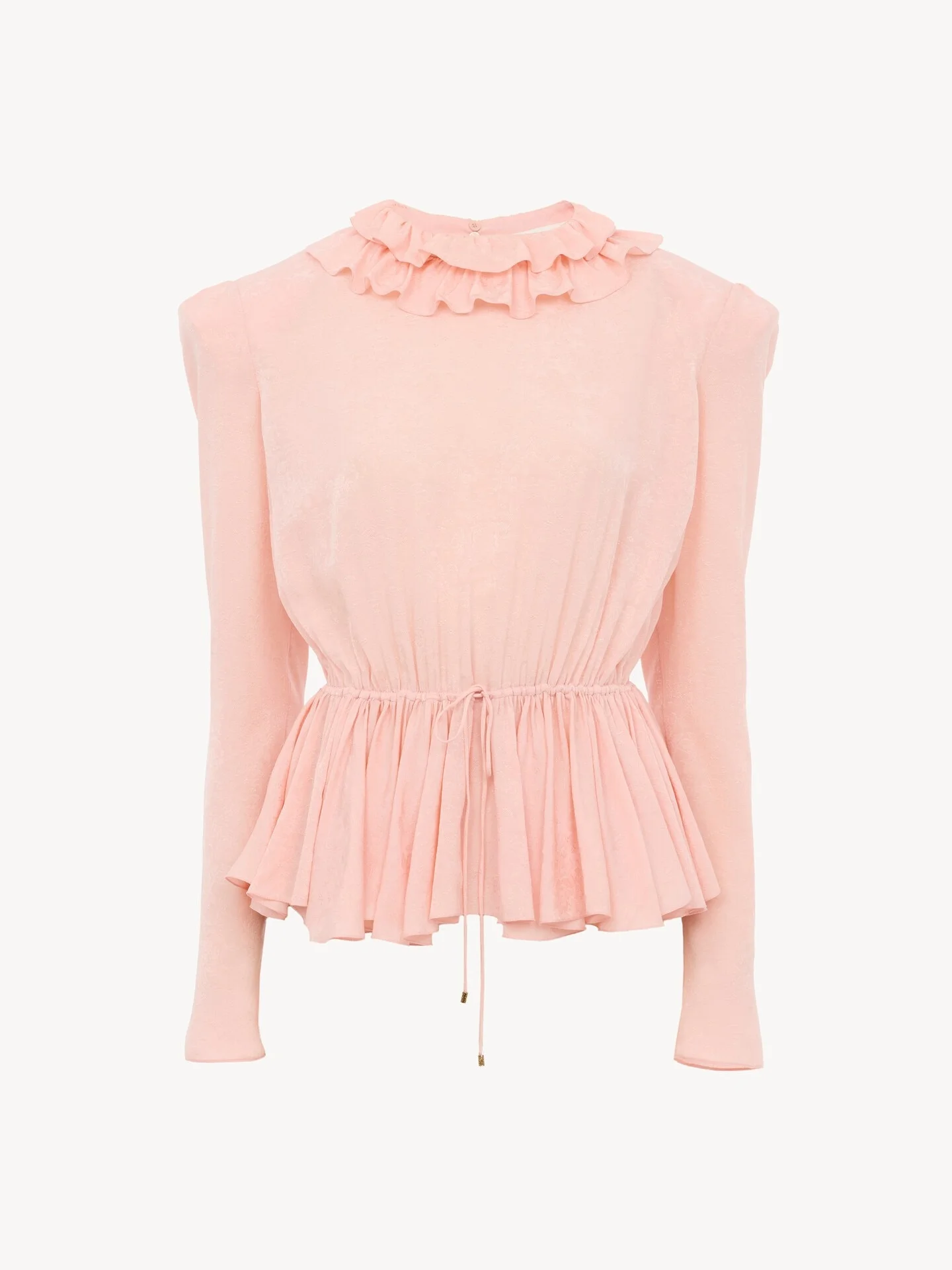 DESCRIPTION Fluid ruffle top in organic silk jacquard with a floral motif, featuring a frilled collar and a cinched drawstring waist finished with gold-tone metal tips. PRODUCT DETAILS Ruffle top outer shell: 100% Silk Lining: 76% Acetate fiber, 24% Silk Buttons: 100% Mother-of-pearl Fit: fluid - The model is 5'10" (178 cm) and wears a prototype in size 38 - Long-sleeve silk top - Mother-of-pearl buttons at back of neck - Drawstring waist with hammered metal tips Organic silk manufacturing restricts the use of pesticides, insecticides or harsh chemicals and incorporates methods that respect biodiversity, improve soil quality and reduce water consumption. Color: Tan Rose Item code: CH26SHT583236L6 CARE INSTRUCTIONS To preserve the integrity of your garment, please refrain from washing, entrusting its care to professional cleaning services for optimal maintenance. TRACEABILITY Better traceability is central to improving our materials as well as social and environmental practices. Dyeing: Italy Finishing: Italy Weaving: Italy Manufacturing : Italy