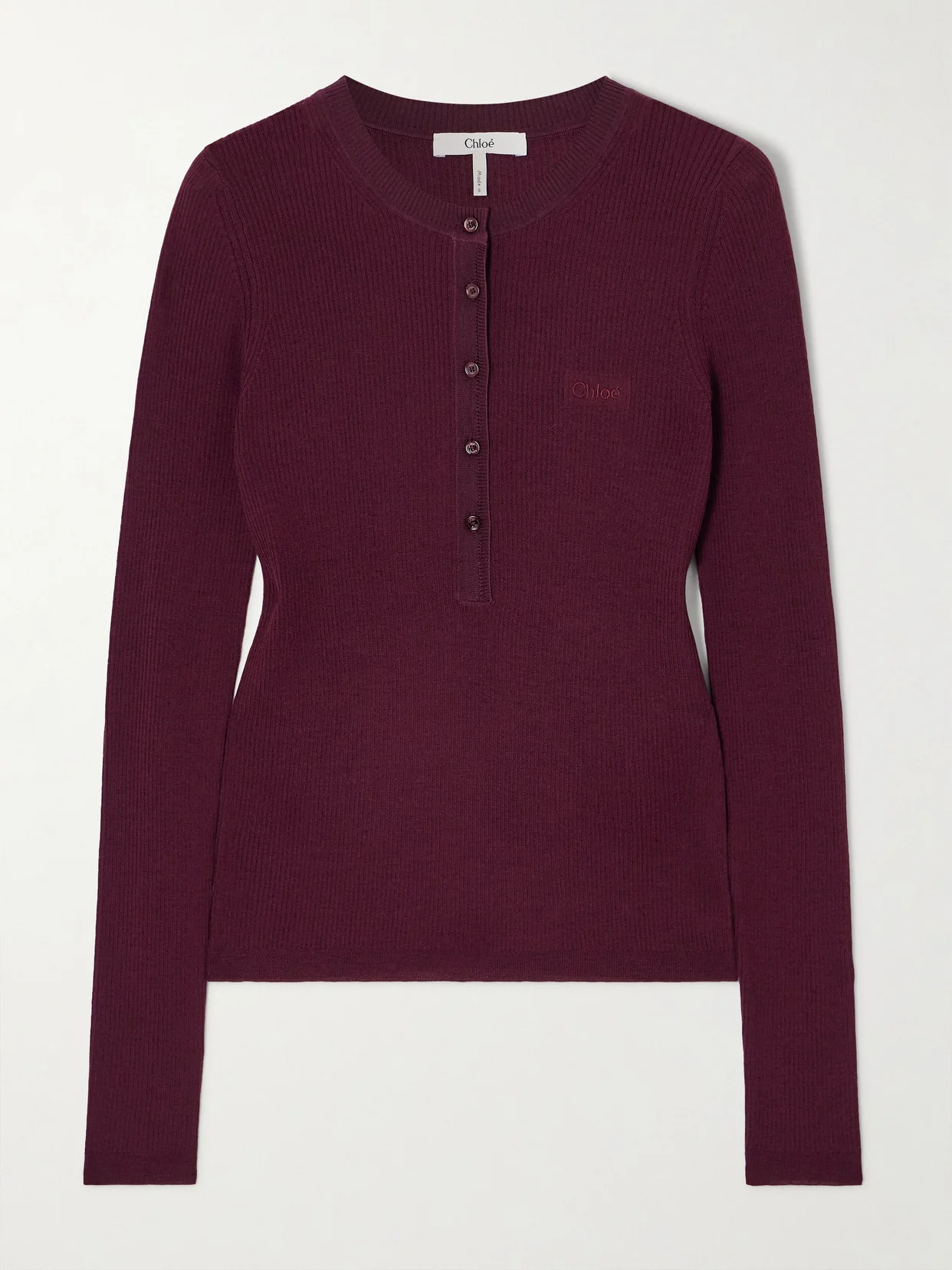 Chloe's sweater is made from naturally insulating wool and has a ribbed finish to accentuate the close fit. The crew neck and buttoned placket are outlined with tonal silk. Lower-Impact Materials. This product is made using at least 50% lower-impact materials or ingredients. Find out more about our NET SUSTAIN criteria here.