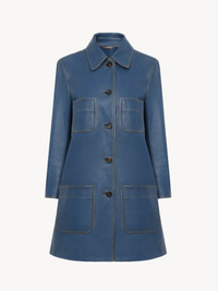 Single-breasted coat in heavy cowhide with patina detail along the seams. Patch pockets and engraved horn buttons finish this piece. PRODUCT DETAILS Single-breasted coat outer shell: 100% Cowhide Main lining: 62% Viscose, 38% Cotton Pocket lining: 100% Cotton Fit: straight - The model is 5'10" (178 cm) and wears a prototype in size 36 - Leather coat - Engraved horn buttons through front - Chest patch pockets - Front patch pockets To make this product, Chloe worked with Leather Working Group (LWG) certified leather manufacturers. LWG certifies tanneries based on their water and energy usage, management of chemicals, solid waste, and wastewater. Color: Stellar Blue Item code: CH25ACM0121344Y