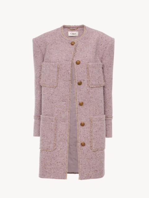 DESCRIPTION Single-breasted collarless coat in lower-impact houndstooth wool, featuring gold-tone jewelry buttons, patch pockets and fringed trims. PRODUCT DETAILS Collarless coat outer shell: 100% Wool Lining: 51% Viscose, 49% Cotton Fit: straight - The model is 5'10" (178 cm) and wears a prototype in size 36 - Chloe wool coat - Jewelry buttons through front - Chest & front flap pockets The wool used in this product comes from a farm that respects animal welfare, maintains soil health, protects biodiversity and promotes native species. Color: Brown Item code: CH26SMA1436293C CARE INSTRUCTIONS To preserve the integrity of your garment, please refrain from washing, entrusting its care to professional cleaning services for optimal maintenance. This garment cannot withstand any bleaching agent. To maintain its shape, gently iron this garment at a maximum sole plate temperature of 110°C, taking care to avoid any harsh pressure while ironing. Entrust this garment to a specialist for mild cleaning with tetrachloroethylene and solvent F, ensuring its delicate nature is maintained with the most care. To best preserve its form and texture, please do not tumble dry this garment. To maintain its delicate nature, do not wet clean this garment. TRACEABILITY Better traceability is central to improving our materials as well as social and environmental practices. Dyeing: Italy Finishing: Italy Weaving: Italy
