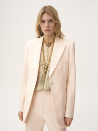 Single-breasted tailored jacket in lower-impact light wool gabardine, featuring oversized front patch pockets and engraved tonal horn buttons. PRODUCT DETAILS Single-breasted tailored jacket outer shell: 100% Wool Lining: 100% Silk Buttons: 100% Water buffalo horn Fit: tailored - The model is 5'10" (178 cm) and wears a prototype in size 36 - Single-breasted Chloe wool jacket - Engraved horn buttons at front & cuffs - Oversized front patch pockets The wool used in this product comes from a farm that respects animal welfare, maintains soil health, protects biodiversity and promotes native species. Color: Biscuit Pink Item code: CH25AVE520666H7