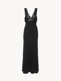 V-neck sleeveless column dress in mini floral jacquard organic silk with lace inserts, featuring fabric-covered buttons and a ribbon tie. PRODUCT DETAILS Column dress outer shell: 100% Silk Secondary material: 56% Cotton, 44% Polyamide Embroidery thread: 100% Polyester Fit: fluid, long - The model is 5'10" (178 cm) and wears a prototype in size 36 - Long silk dress - Fabric-covered buttons at the side - Ribbon tie fastened at back Organic silk manufacturing restricts the use of pesticides, insecticides or harsh chemicals and incorporates methods that respect biodiversity, improve soil quality and reduce water consumption. This product was made in collaboration with Akanjo, a certified WFTO supplier. Akanjo is a social enterprise located in Madagascar that places equal pay and employees' health & wellbeing at the core of their priorities. A long-standing partner of Chloe for 15 years, Akanjo is also committed to training and promoting craftsmanship. Color: Black Item code: CH25WRO05332001
