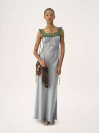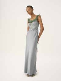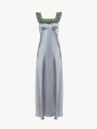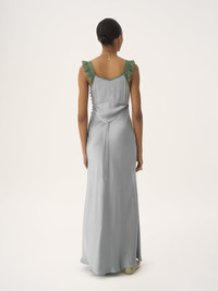 Square-neck sleeveless column dress in washed silk satin with lace inserts, featuring fabric-covered buttons and a ribbon tie. PRODUCT DETAILS Column dress outer shell: 100% Silk Main lacework: 90% Cotton, 10% Polyamide Fit: fluid, long - The model is 5'10" (178 cm) and wears a prototype in size 36 - Long silk dress - Fabric-covered buttons at the side - Ribbon tie fastened at back Color: Ash Blue Item code: CH25WRO02008466