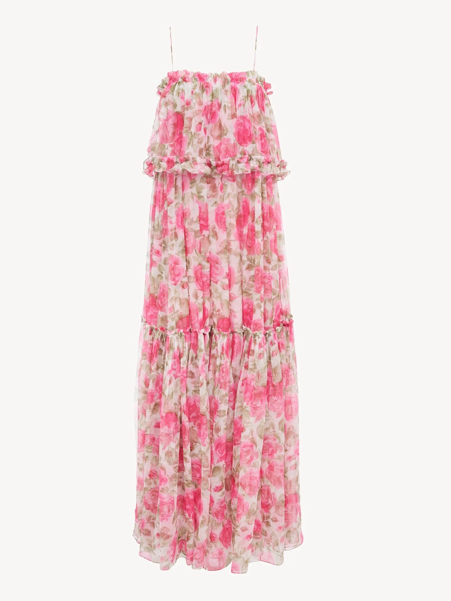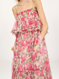 DESCRIPTION Sleeveless long dress in organic silk mousseline with a silk-mix lining, featuring a roses print rooted in the Maison's heritage. Cut in a fluid, ruffled silhouette, the thin-strap dress is finished with fabric-covered buttons at the side. PRODUCT DETAILS Sleeveless long dress outer shell: 100% Silk Secondary material: 100% Cotton Lining: 90% Acetate fiber, 10% Silk Fit: fluid, long - The model is 5'10" (178 cm) and wears a prototype in size 36 - Thin-strap silk dress - Side hook & fabric-covered buttons Organic silk manufacturing restricts the use of pesticides, insecticides or harsh chemicals and incorporates methods that respect biodiversity, improve soil quality and reduce water consumption. This product was made in collaboration with Akanjo, a certified WFTO supplier. Akanjo is a social enterprise located in Madagascar that places equal pay and employees' health & wellbeing at the core of their priorities. A long-standing partner of Chloe for 15 years, Akanjo is also committed to training and promoting craftsmanship. Color: White & Pink Item code: CH26UR12427891Y CARE INSTRUCTIONS To preserve the integrity of your garment, please refrain from washing, entrusting its care to professional cleaning services for optimal maintenance. This garment cannot withstand any bleaching agent. To maintain its shape, gently iron this garment at a maximum sole plate temperature of 110°C, taking care to avoid any harsh pressure while ironing. Entrust this garment to a specialist for mild cleaning with tetrachloroethylene and solvent F, ensuring its delicate nature is maintained with the most care. To best preserve its form and texture, please do not tumble dry this garment. To maintain its delicate nature, do not wet clean this garment. TRACEABILITY Better traceability is central to improving our materials as well as social and environmental practices. Finishing: Italy Weaving: Italy