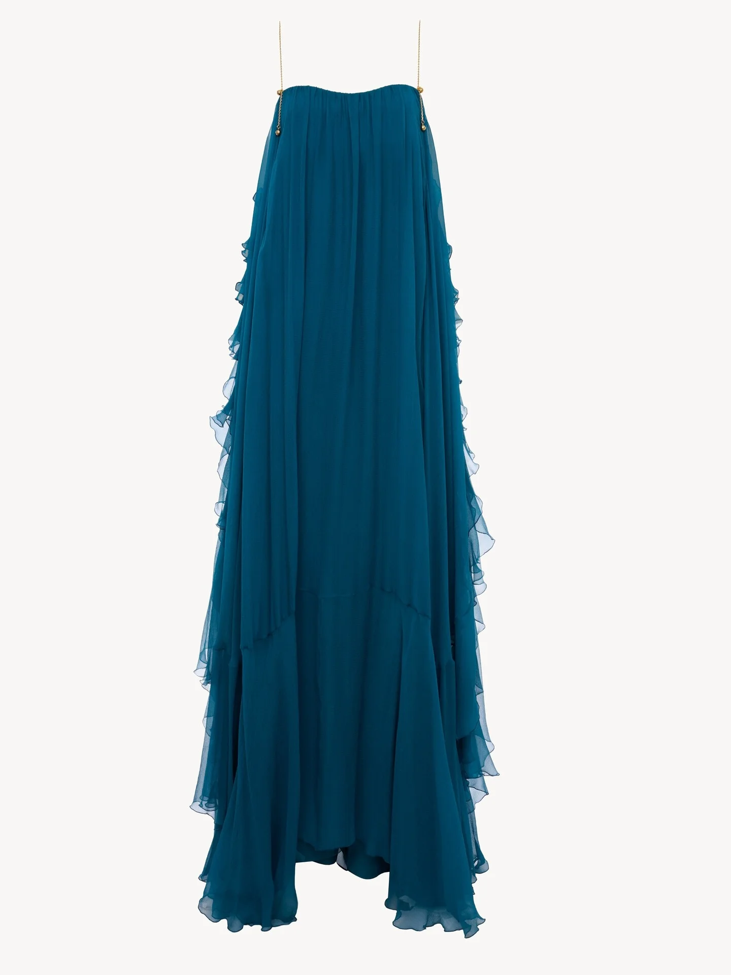DESCRIPTION Sleeveless long dress in iconic organic silk mousseline with a separate silk-mix lining, featuring a fluid, ruffled silhouette and adjustable thin chain straps. PRODUCT DETAILS Sleeveless long dress outer shell: 100% Silk Lining: 90% Acetate fiber, 10% Silk Buttons: 100% Mother-of-pearl Fit: fluid, long - The model is 5'10" (178 cm) and wears a prototype in size 36 - Thin-strap silk dress - Side hook fastening - Mother-of-pearl buttons at side - Separate lining Organic silk manufacturing restricts the use of pesticides, insecticides or harsh chemicals and incorporates methods that respect biodiversity, improve soil quality and reduce water consumption. This product was made in collaboration with Akanjo, a certified WFTO supplier. Akanjo is a social enterprise located in Madagascar that places equal pay and employees' health & wellbeing at the core of their priorities. A long-standing partner of Chloe for 15 years, Akanjo is also committed to training and promoting craftsmanship. Color: Lovely Teal Item code: CH26SRO130013K5 CARE INSTRUCTIONS To preserve the integrity of your garment, please refrain from washing, entrusting its care to professional cleaning services for optimal maintenance. This garment cannot withstand any bleaching agent. To maintain its shape, gently iron this garment at a maximum sole plate temperature of 110°C, taking care to avoid any harsh pressure while ironing. Entrust this garment to a specialist for mild cleaning with tetrachloroethylene and solvent F, ensuring its delicate nature is maintained with the most care. To best preserve its form and texture, please do not tumble dry this garment. To maintain its delicate nature, do not wet clean this garment. TRACEABILITY Better traceability is central to improving our materials as well as social and environmental practices. Dyeing: France Finishing: France Weaving: France