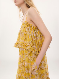 DESCRIPTION Sleeveless long dress in organic silk mousseline with a silk-mix lining, featuring a roses print rooted in the Maison's heritage. Cut in a fluid, ruffled silhouette, the thin-strap dress is finished with fabric-covered buttons at the side. PRODUCT DETAILS Sleeveless long dress outer shell: 100% Silk Secondary material: 100% Cotton Lining: 90% Acetate fiber, 10% Silk Fit: fluid, long - The model is 5'10" (178 cm) and wears a prototype in size 36 - Thin-strap silk dress - Side hook & fabric-covered buttons Organic silk manufacturing restricts the use of pesticides, insecticides or harsh chemicals and incorporates methods that respect biodiversity, improve soil quality and reduce water consumption. This product was made in collaboration with Akanjo, a certified WFTO supplier. Akanjo is a social enterprise located in Madagascar that places equal pay and employees' health & wellbeing at the core of their priorities. A long-standing partner of Chloe for 15 years, Akanjo is also committed to training and promoting craftsmanship. Color: White & Yellow Item code: CH26UR12427592D CARE INSTRUCTIONS To preserve the integrity of your garment, please refrain from washing, entrusting its care to professional cleaning services for optimal maintenance. This garment cannot withstand any bleaching agent. To maintain its shape, gently iron this garment at a maximum sole plate temperature of 110°C, taking care to avoid any harsh pressure while ironing. Entrust this garment to a specialist for mild cleaning with tetrachloroethylene and solvent F, ensuring its delicate nature is maintained with the most care. To best preserve its form and texture, please do not tumble dry this garment. To maintain its delicate nature, do not wet clean this garment. TRACEABILITY Better traceability is central to improving our materials as well as social and environmental practices. Finishing: Italy Weaving: France