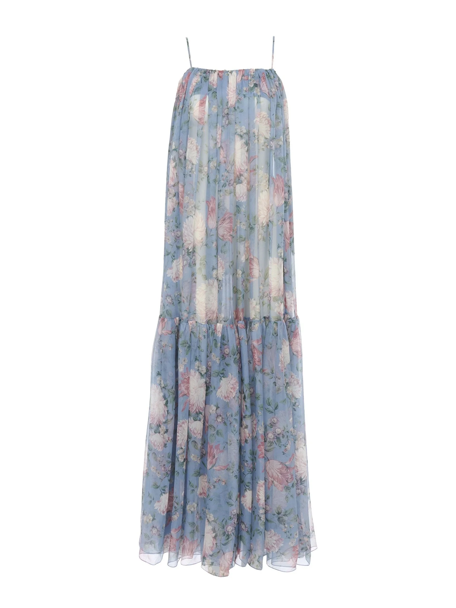 Sleeveless long dress in organic silk mousseline with a silk-mix lining, featuring an all-over peonies print inspired by the Maison's heritage. Thin straps finish the fluid, tiered silhouette. PRODUCT DETAILS Sleeveless long dress outer shell: 100% Silk Lining: 68% Acetate fiber, 32% Silk Fit: fluid, long We recommend taking one size above your regular size. - The model is 5'10" (178 cm) and wears a prototype in size 36 - Sleeveless printed dress - Fabric-covered buttons at left side - Side pockets Care: dry cleaning only This product is made of a fragile material. Take special care when wearing jewelry or accessories that may damage the product by catching on or pulling the fabric. Any uneven weaving is due to the nature of the material. Organic silk manufacturing restricts the use of pesticides, insecticides or harsh chemicals and incorporates methods that respect biodiversity, improve soil quality and reduce water consumption. This product was made in collaboration with Akanjo, a certified WFTO supplier. Akanjo is a social enterprise located in Madagascar that places equal pay and employees' health & wellbeing at the core of their priorities. A long-standing partner of Chloe for 15 years, Akanjo is also committed to training and promoting craftsmanship. Color: Grizzled Blue Item code: CH25URO55459468