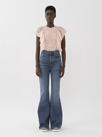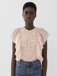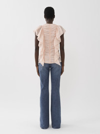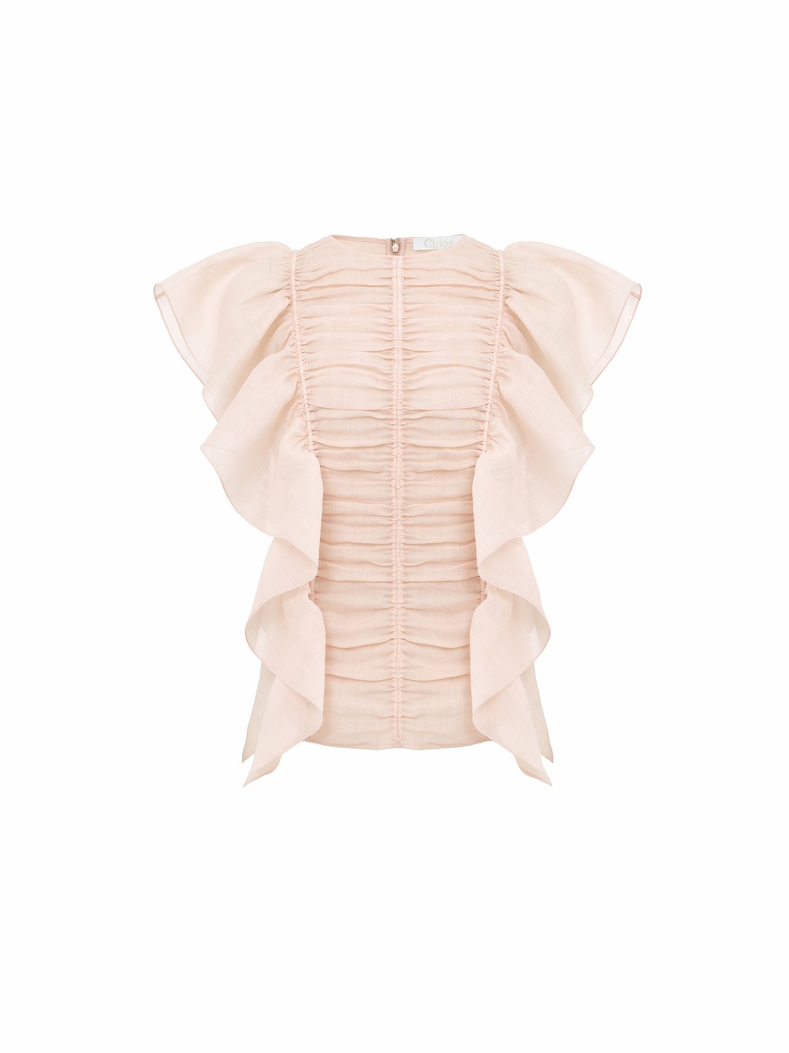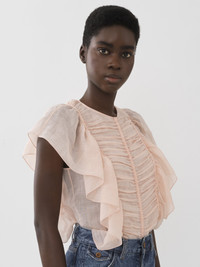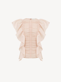 Cut from sheer and delicate ramie voile, this sleeveless ruffle top combines a ruched front with feminine flounces along the sides. This product was made in collaboration with Akanjo, a certified WFTO supplier. Akanjo is a social enterprise located in Madagascar that places equal pay and employees' health & wellbeing at the core of their priorities. A long-standing partner of Chloé for 15 years, Akanjo is also committed to training and promoting craftsmanship. PRODUCT DETAILS Sleeveless ruffle top main material: 100% Ramie Care: dry cleaning only Fit: classic, sleeveless - The model is 5'10'' (178 cm) and wears a prototype in size 36 - Blouse - Concealed back zip & hook fastening Linen, hemp and ramie cultivations emit less greenhouse gases and require less water compared to other conventional natural fibers, which is why they are considered lower-impact materials by nature. Color: Pansy Pink Item code: CHC23SHT200166H5