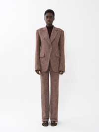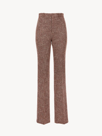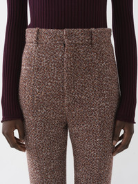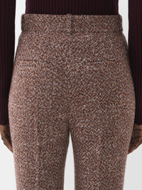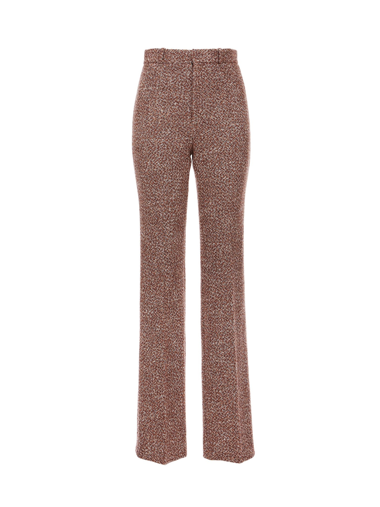 These slim flared pants are made from a tie-dye fabric with a multicolor thread and a pop of fuchsia for a fall hue. The slim silhouette, elongated leg and mid-season tailoring instill this piece with timeless elegance. Wear these pants with the matching tailored jacket for the full look. PRODUCT DETAILS Slim flared pants main material: 55% Wool, 36% Cotton, 9% Polyacrylic Lining: 100% Silk Care: dry clean only Fit: high waist, slim, flared - The model is 5’10” (178 cm) and wears a prototype in size 36 - Tailored pants - Front hook & zipper fastening - Back pockets - Belt loops Color: Multicolor Item code: CHC23APA081799CB