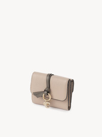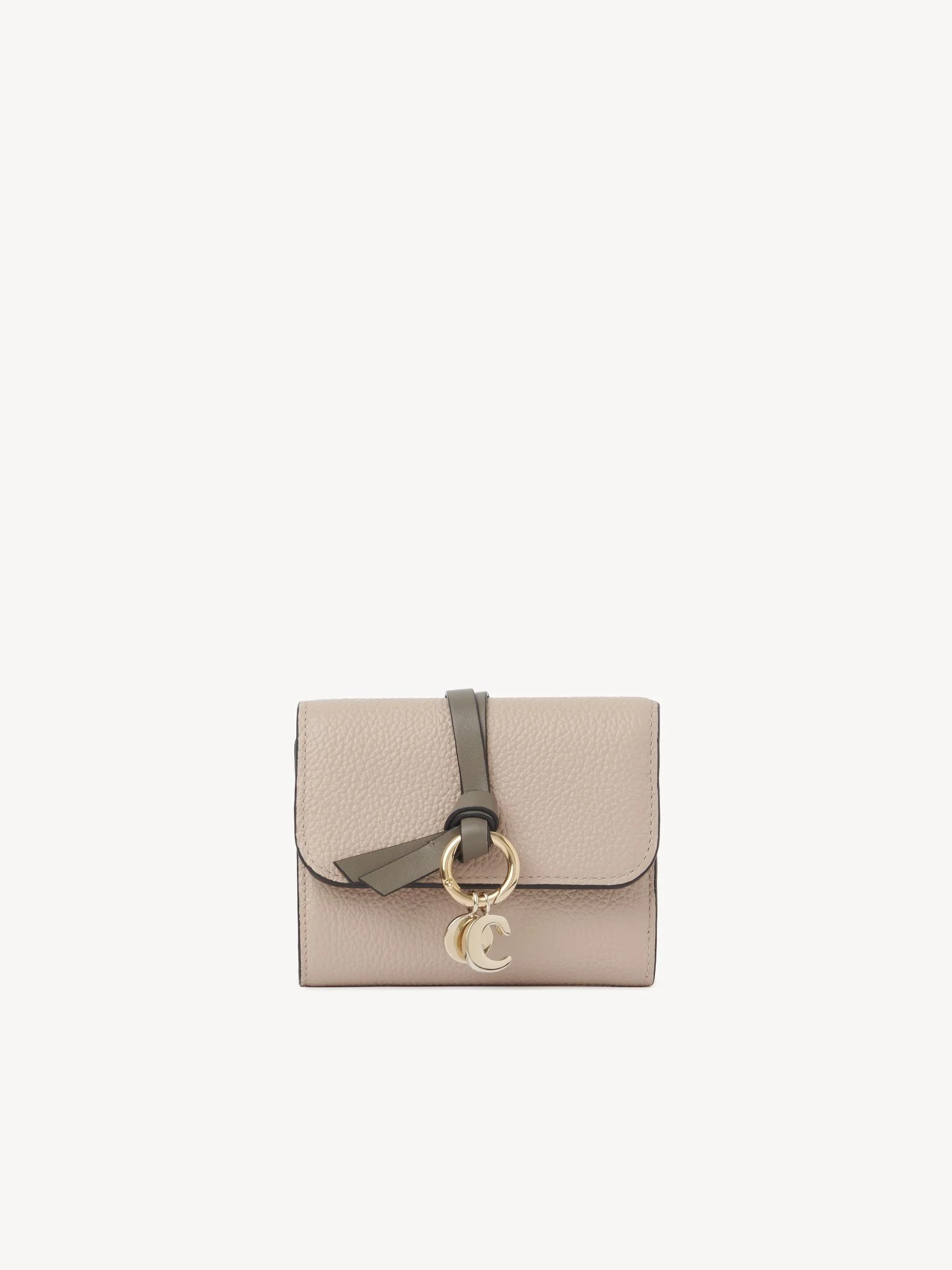 The Maison's iconic Alphabet line includes this tri-fold wallet in bicolor grained and shiny calfskin. Designed to hold the essentials, it features multiple card slots and one flat pocket. The front is finished with a knotted link and Chloe-designed golden initial charms. This small wallet will slip easily into your clutch or a small bag. PRODUCT DETAILS Small tri-fold wallet in bicolor grained & shiny calfskin Main lining: Lambskin Flap lining: Calfskin Inside trim: 65% Polyester, 35% Cotton - 1 flat pocket - 6 card slots - 1 note/bill compartment - Snap button closure Comes with a dust bag - Width: 4.3" (11 cm) - Height: 3.5" (9 cm) - Depth: 1.6" (4 cm) To make this product, Chloe worked with Leather Working Group (LWG) certified leather manufacturers. LWG certifies tanneries based on their water and energy usage, management of chemicals, solid waste, and wastewater. Color: Earthy Pink Item code: CH25UP718P476I4
