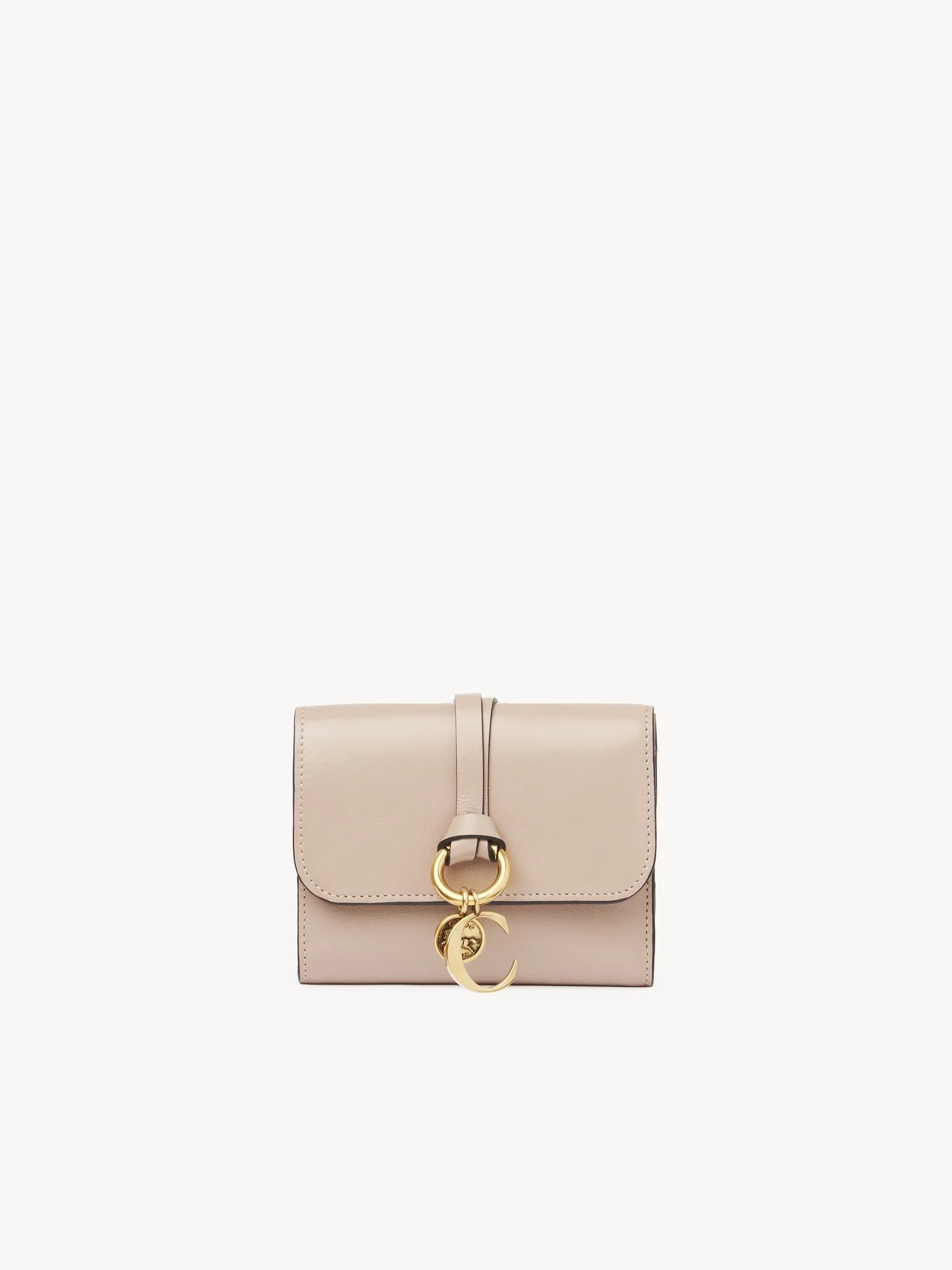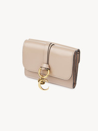 The Maison's iconic Alphabet line includes this small tri-fold wallet in shiny calfskin. Designed to hold the essentials, it features multiple card slots and one flat pocket. The front is finished with a knotted link and Chloe's signature golden initial and Horse Medal charms. This small wallet will slip easily into your clutch or a small bag. PRODUCT DETAILS Small tri-fold wallet with leather link in shiny calfskin Main lining: 65% Polyester, 35% Cotton - 1 flat pocket - 6 card slots - 1 bill compartment - Snap button closure Comes with a dust bag - Width: 4.3" (11 cm) - Height: 3.5" (9 cm) - Depth: 1.6" (4 cm) This small wallet is made from natural leather with a very light finish. Keep away from water (rain). The wallet may develop smooth or light halos. If the leather gets wet, dry it with a soft white cloth to absorb water. With use, the leather may become marked. To make this product, Chloe worked with Leather Working Group (LWG) certified leather manufacturers. LWG certifies tanneries based on their water and energy usage, management of chemicals, solid waste, and wastewater. Color: Deep Beige Item code: CHC25SP536O1628V