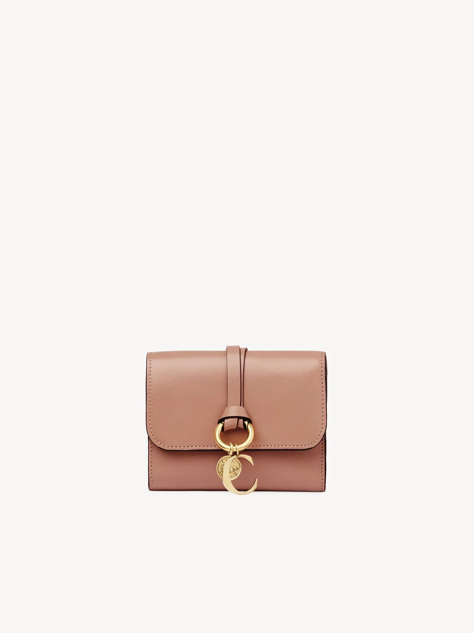 The Maison's iconic Alphabet line includes this small tri-fold wallet in shiny calfskin. Designed to hold the essentials, it features multiple card slots and one flat pocket. The front is finished with a knotted link and Chloe's signature golden initial and Horse Medal charms. This small wallet will slip easily into your clutch or a small bag. PRODUCT DETAILS Small tri-fold wallet with leather link in shiny calfskin Main lining: 65% Polyester, 35% Cotton - 1 flat pocket - 6 card slots - 1 bill compartment - Snap button closure Comes with a dust bag - Width: 4.3" (11 cm) - Height: 3.5" (9 cm) - Depth: 1.6" (4 cm) To make this product, Chloe worked with Leather Working Group (LWG) certified leather manufacturers. LWG certifies tanneries based on their water and energy usage, management of chemicals, solid waste, and wastewater. Color: Wooden Orange Item code: CHC25SP536O16847