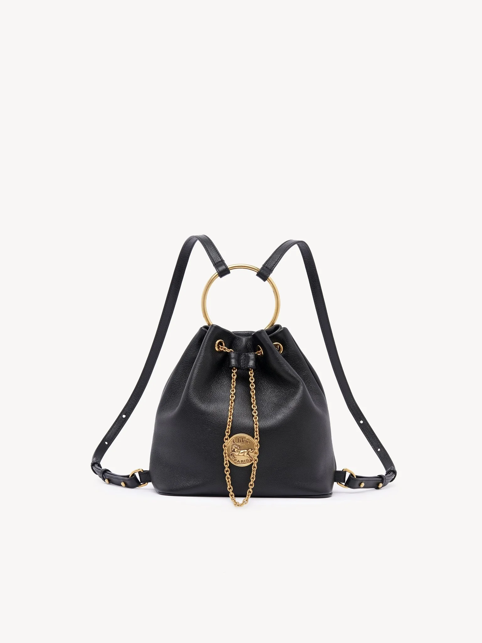 The small Bracelet backpack is crafted from grained buffalo leather. The supple silhouette is embellished with an oversized bracelet handle, a drawstring chain and the Maison's signature Horse Medal. Carry this small Bracelet bag in the hand or over the shoulders with the removable straps. PRODUCT DETAILS Small Bracelet backpack in grained buffalo leather Main material: Buffalo leather Main lining: 55% Cotton, 45% Linen Carry: Back & hand - 1 main compartment - 1 inside pocket - 1 removable ring handle - 2 adjustable & removable straps - Magnet & drawstring closure Comes with a dust bag - Width: 8.7" (22 cm) - Height: 8.7" (22 cm) - Depth: 4.1" (10.5 cm) - Handle drop: 8.7" (8.5 cm) - Min. strap drop: 16.5" (41 cm) - Max. strap drop: 19.7" (47 cm) This backpack is made from semi-aniline leather. Tanning imparts a specific character to the skin, such as hues and wrinkles, combined with a light and transparent aniline finish. Respect the care instructions on the leaflet. To make this product, Chloe worked with Leather Working Group (LWG) certified leather manufacturers. LWG certifies tanneries based on their water and energy usage, management of chemicals, solid waste, and wastewater. Color: Black Item code: CH25US774O37001