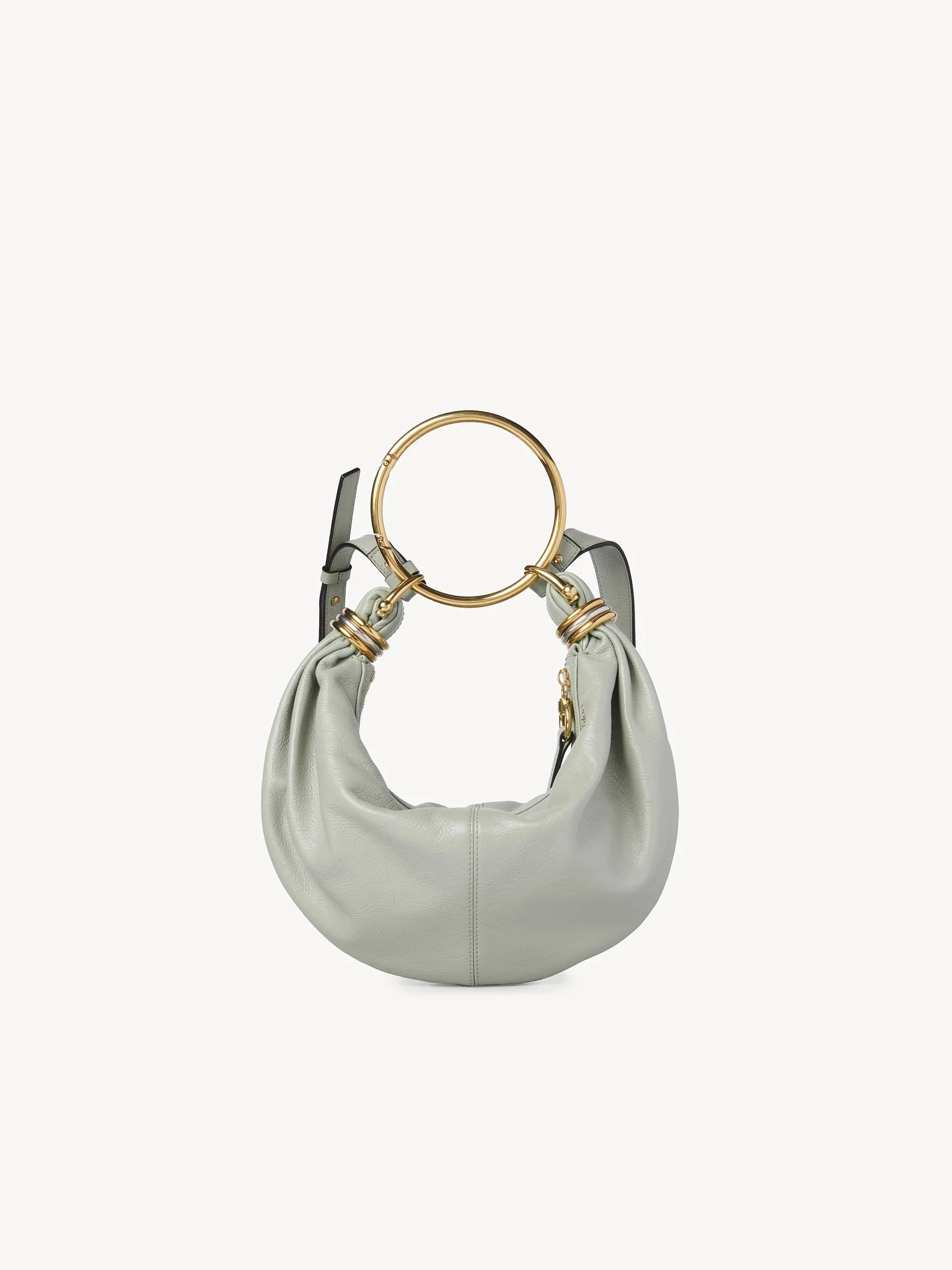 Inspired by the Maison's Archives, this small Bracelet Hobo bag is crafted from shiny grained calfskin. The supple, rounded shape is elevated by a bracelet handle and stacked bi-color rings at the ends. Carry the small Bracelet bag in the hand or on the shoulder. PRODUCT DETAILS Small Bracelet Hobo bag in shiny grained calfskin Main material: Calfskin Main lining: Calfskin Carry: Hand, shoulder & cross-body - 1 main compartment - 1 inside flat pocket - Zip closure - 1 removable ring handle - 1 adjustable & removable strap Comes with a dust bag - Width: 12.6" (32 cm) - Height: 5.5" (14 cm) - Depth: 3.9" (10 cm) - Handle drop: 7.9" (20 cm) - Min. strap drop: 19.7" (50 cm) - Max. strap drop: 23.6" (60 cm) This handbag is made from natural leather with a very light finish. Keep away from water (rain). The bag may develop smooth or light halos. If the leather gets wet, dry it with a soft white cotton cloth to absorb water. With use, the leather may become marked. For large and medium size bags, the handle will arrive inside the bag. Do not throw it away. To make this product, Chloe worked with Leather Working Group (LWG) certified leather manufacturers. LWG certifies tanneries based on their water and energy usage, management of chemicals, solid waste, and wastewater. Color: Sea Grass Item code: CHC24AS611N7238Y