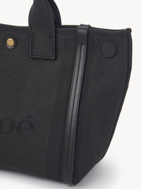 The small Chloe Carry tote bag is crafted from striped cotton canvas jacquard complemented by contrasting vertical leather bands and an oversized Chloe logo. This day bag has magnets at the sides, allowing the structured silhouette to be adjusted to a rounded, more compact shape. Carry with the double handles or the adjustable, removable strap. PRODUCT DETAILS Small Chloe Carry tote bag in cotton canvas Main material: 91% Cotton, 6% Polyester, 3% Other fibers <5% Secondary material: Calfskin Main lining: 91% Cotton, 6% Polyester, 3% Other fibers <5% Carry: Hand, shoulder & crossbody - 1 main compartment - 1 inside flat pocket - Adjustable & removable strap - Snap closure Comes with a dust bag - Width: 10.6" (27 cm) - Height: 9.3" (23.5 cm) - Depth: 4.7" (12 cm) - Handle drop: 4.3" (11 cm) - Min. strap drop: 19.7" (50 cm) - Max. strap drop: 22.8" (58 cm) This product is made from recycled cotton. Recycled cotton keeps its natural softness and inherent quality with a reduced environmental impact. Using recycled cotton enables us to extend the lifespan of a fiber that has already been produced. Color: Black Item code: CHC25SS911O65001