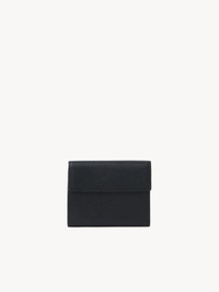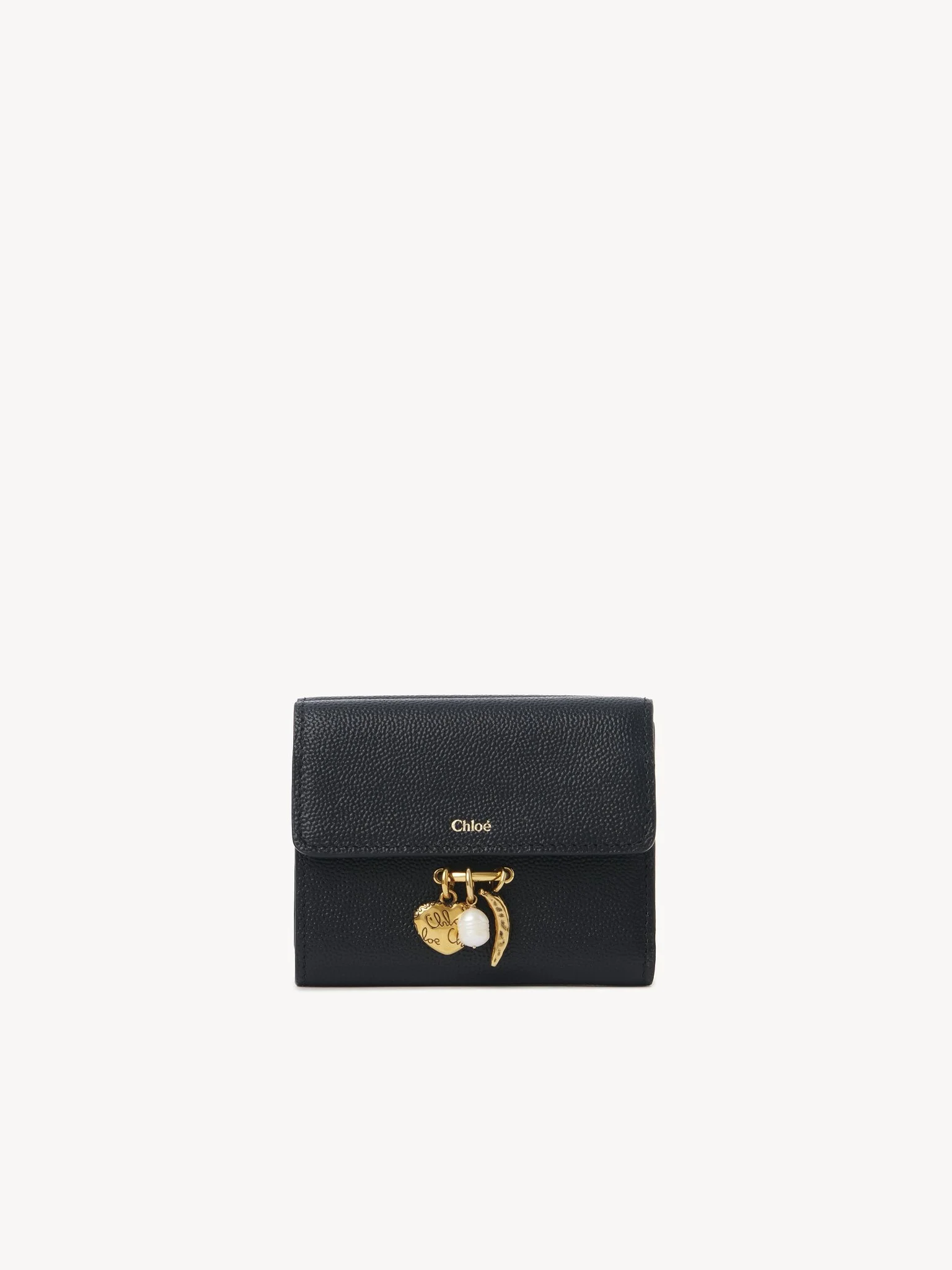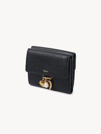 Crafted from shiny grained calfskin, this small Chloe Charms tri-fold wallet has one bill compartment and multiple card slots. The classic silhouette is embellished with the Chloe logo, while pearl, heart and banana charms nod to the Maison's heritage. PRODUCT DETAILS Small tri-fold wallet in shiny grained calfskin Main lining: Lambskin Flap lining: Calfskin Inside trim: 65% Polyester, 35% Cotton - 1 bill compartment - 6 card slots - 1 back pocket - Snap button closure Comes with a dust bag - Width: 4.3" (11 cm) - Height: 3.9" (10 cm) - Depth: 1.2" (3 cm) To make this product, Chloe worked with Leather Working Group (LWG) certified leather manufacturers. LWG certifies tanneries based on their water and energy usage, management of chemicals, solid waste, and wastewater. Color: Black Item code: CH25AP976Q12001