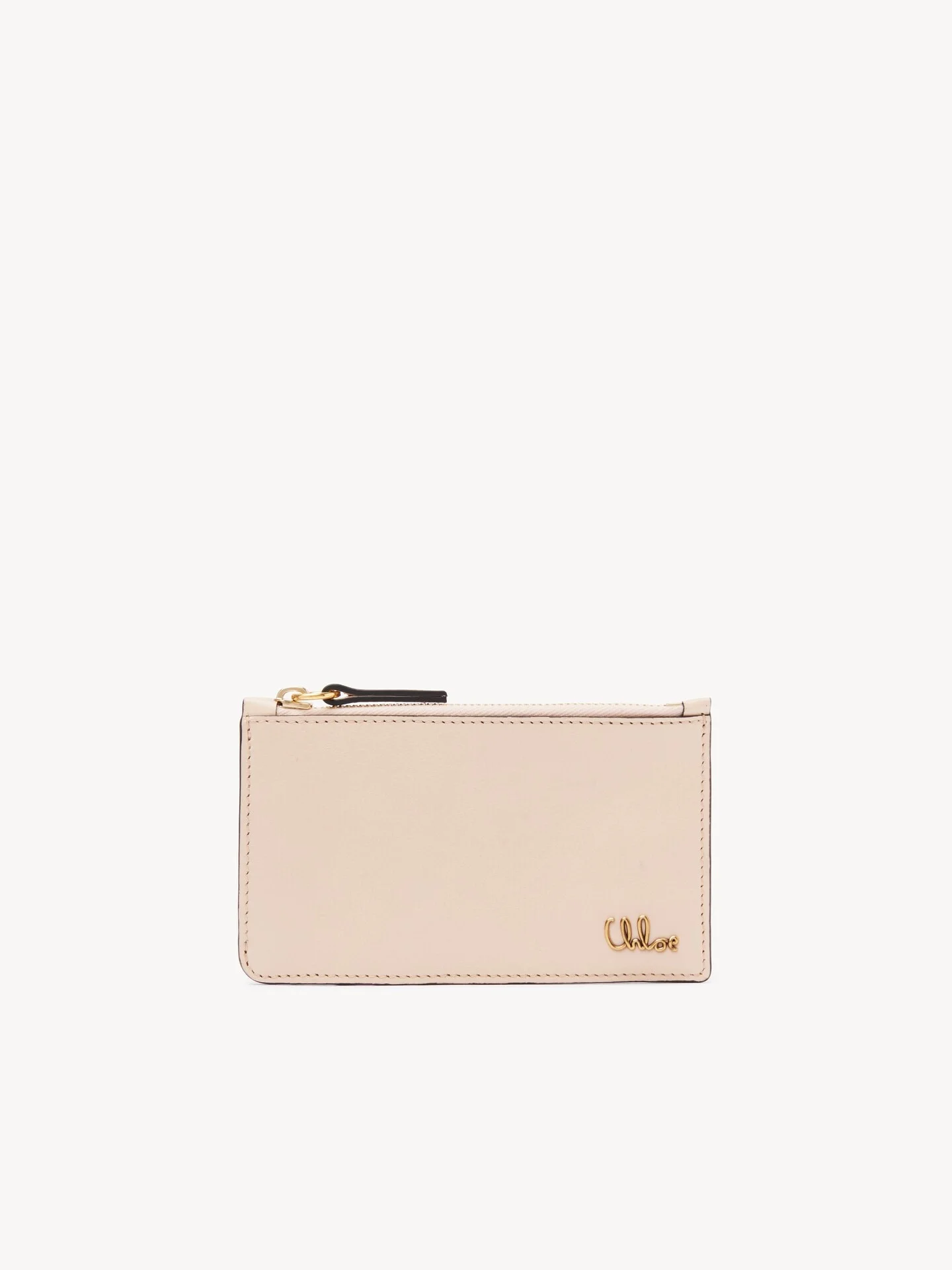 Crafted from shiny calfskin, the small Chloe Iconic purse combines a minimalist design with a metallic signature from the Maison's archives. Sized to fit the essentials, this small purse features a zipped compartment and four card slots on the back. PRODUCT DETAILS Small purse in shiny calfskin Main lining: Calfskin Inner lining: 65% Polyester, 35% Cotton - 1 main compartment - 4 card slots - 1 flat pocket Comes with a dust bag - Width: 5.1" (13 cm) - Height: 3.1" (8 cm) - Depth: 0.8" (2 cm) This small purse is made from natural leather with a very light finish. Keep away from water (rain). The purse may develop smooth or light halos. If the leather gets wet, dry it with a soft white cloth to absorb water. With use, the leather may become marked. To make this product, Chloe worked with Leather Working Group (LWG) certified leather manufacturers. LWG certifies tanneries based on their water and energy usage, management of chemicals, solid waste, and wastewater. Color: Cement Pink Item code: CH25SP481O166J5