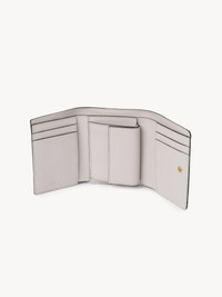 Crafted from grained buffalo leather, the small Chloe Iconic tri-fold wallet combines a minimalist design with a metallic signature from the Maison's Archives. This small wallet features a coin pocket, bill compartment and multiple card slots. PRODUCT DETAILS Small tri-fold wallet in grained buffalo leather Main lining: Lambskin Inside trim: 65% Polyester, 35% Cotton - 1 bill compartment - 1 coin pocket - 4 card slots - 2 flat pockets - Snap button closure Comes with a dust bag - Width: 4.3" (11 cm) - Height: 3.5" (9 cm) - Depth: 1.6" (4 cm) To make this product, Chloe worked with Leather Working Group (LWG) certified leather manufacturers. LWG certifies tanneries based on their water and energy usage, management of chemicals, solid waste, and wastewater. Color: Wild Grey Item code: CH25AP483O37084