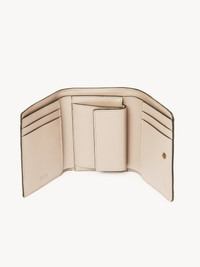 Crafted from shiny calfskin, the small Chloe Iconic tri-fold wallet combines a minimalist design with a metallic signature from the Maison's archives. This small wallet features a coin pocket, bill compartment and multiple card slots. PRODUCT DETAILS Small tri-fold wallet in shiny calfskin Main lining: Calfskin Inner lining: 65% Polyester, 35% Cotton - 1 bill compartment - 1 coin pocket - 4 card slots - 2 flat pockets - Snap button closure Comes with a dust bag - Width: 4.3" (11 cm) - Height: 3.5" (9 cm) - Depth: 1.6" (4 cm) This small wallet is made from natural leather with a very light finish. Keep away from water (rain). The wallet may develop smooth or light halos. If the leather gets wet, dry it with a soft white cloth to absorb water. With use, the leather may become marked. To make this product, Chloe worked with Leather Working Group (LWG) certified leather manufacturers. LWG certifies tanneries based on their water and energy usage, management of chemicals, solid waste, and wastewater. Color: Cement Pink Item code: CH25SP483O166J5