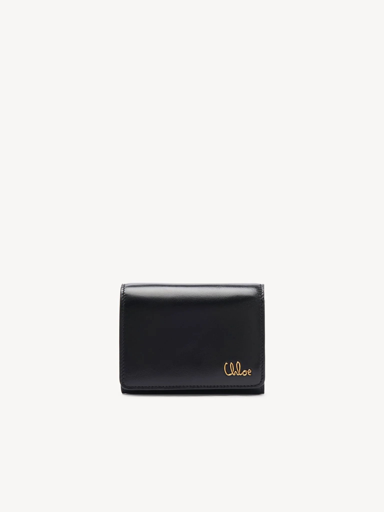 Crafted from shiny calfskin, the small Chloe Iconic tri-fold wallet combines a minimalist design with a metallic signature from the Maison's archives. This small wallet features a coin pocket, bill compartment and multiple card slots. PRODUCT DETAILS Small tri-fold wallet in shiny calfskin Main lining: Calfskin Inner lining: 65% Polyester, 35% Cotton - 1 bill compartment - 1 coin pocket - 4 card slots - 2 flat pockets - Snap button closure Comes with a dust bag - Width: 4.3" (11 cm) - Height: 3.5" (9 cm) - Depth: 1.6" (4 cm) This small wallet is made from natural leather with a very light finish. Keep away from water (rain). The wallet may develop smooth or light halos. If the leather gets wet, dry it with a soft white cloth to absorb water. With use, the leather may become marked. To make this product, Chloe worked with Leather Working Group (LWG) certified leather manufacturers. LWG certifies tanneries based on their water and energy usage, management of chemicals, solid waste, and wastewater. Color: Black Item code: CH25SP483O16001