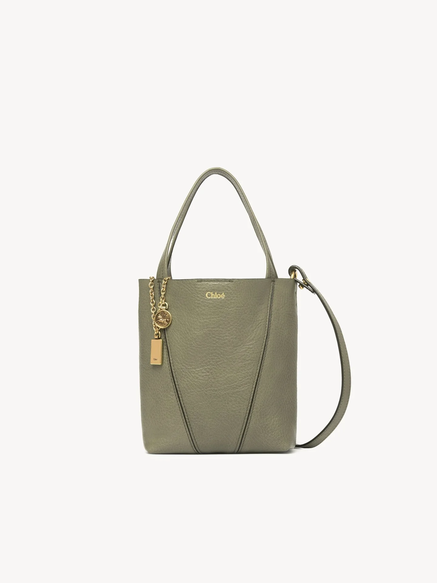 DESCRIPTION Crafted from shiny grained cowhide, the small Chloe Spin tote bag has a minimalist silhouette elevated with graphic lines. A dangling chain features the Maison's signature Chloe and Horse Medals. The compact interior combines with double handles and a removable strap. Wear on the shoulder, crossbody, or slide the handles through the ring for hand or wrist carry. PRODUCT DETAILS Small Chloe Spin tote bag in shiny grained cowhide Main material: Cowhide Carry: Shoulder, crossbody, hand & wrist - 1 main compartment - Removable and adjustable strap - Magnetic closure Comes with a dust bag - Width: 7.1" (18 cm) - Height: 7.5" (19 cm) - Depth: 3.1" (8 cm) - Handle drop: 5.1" (13 cm) - Min. strap drop: 23.6" (60 cm) - Max. strap drop: 25.6" (65 cm) To make this product, Chloe worked with Leather Working Group (LWG) certified leather manufacturers. LWG certifies tanneries based on their water and energy usage, management of chemicals, solid waste, and wastewater. This Chloe Spin bag is made with unlined leather, so there may be slight marks inside the bag, such as veins or scratches. Colour: Aloe Green Item code: CH25SS812N843D6 CARE INSTRUCTIONS In order to protect this article, we recommend that you: avoid overloading your bag avoid rubbing against abrasive materials shield it from humidity, light and heat avoid contact with liquids and greasy substances (makeup, cream) store your bag carefully in its dustcover when not in use avoid rubbing against color-contrasting clothes or materials to remove a water stain, gently soak up liquid by dabbing it with a white cloth should a scratch occur on the leather, you can gently massage it with the same type of cloth for all other issues, please contact the Chloe after-sales service or a specialist. TRACEABILITY Better traceability is central to improving our materials as well as social and environmental practices. Dyeing: Italy Finishing: Italy Tanning: Italy