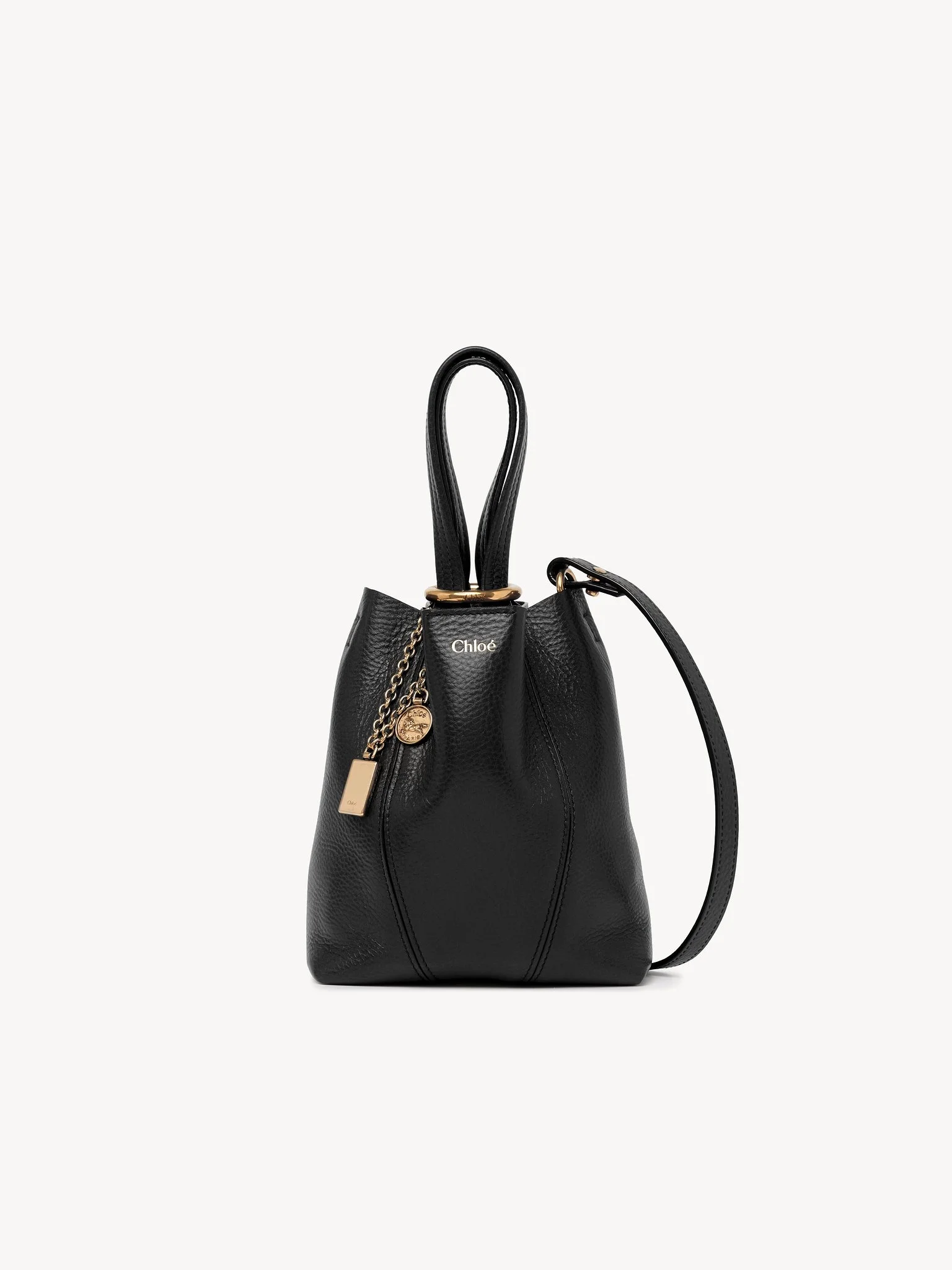 Crafted from shiny grained calfskin, the small Chloe Spin tote bag has a minimalist silhouette elevated with graphic lines. A dangling chain features the Maison's signature Chloe and Horse Medals. The compact interior combines with double handles and a removable strap. Wear on the shoulder, crossbody, or slide the handles through the ring for relaxed hand or wrist carry. PRODUCT DETAILS Chloe Spin tote bag in shiny grained calfskin Main material: Cowhide Main lining: Cowhide Carry: Shoulder, crossbody, hand & wrist - 1 main compartment - Removable and adjustable strap - Magnetic closure Comes with a dust bag - Width: 7.1" (18 cm) - Height: 7.5" (19 cm) - Depth: 3.1" (8 cm) - Handle drop: 5.1" (13 cm) - Min. strap drop: 23.6" (60 cm) - Max. strap drop: 25.6" (65 cm) This tote bag is made from semi-aniline leather. The half-transparent finish imparts a robust nature to the product while preserving its natural character. Follow all care instructions on the insert. This Chloe Spin bag is made with unlined leather, so there may be slight marks inside the bag, such as veins or scratches. Color: Black Item code: CH25SS812N84001