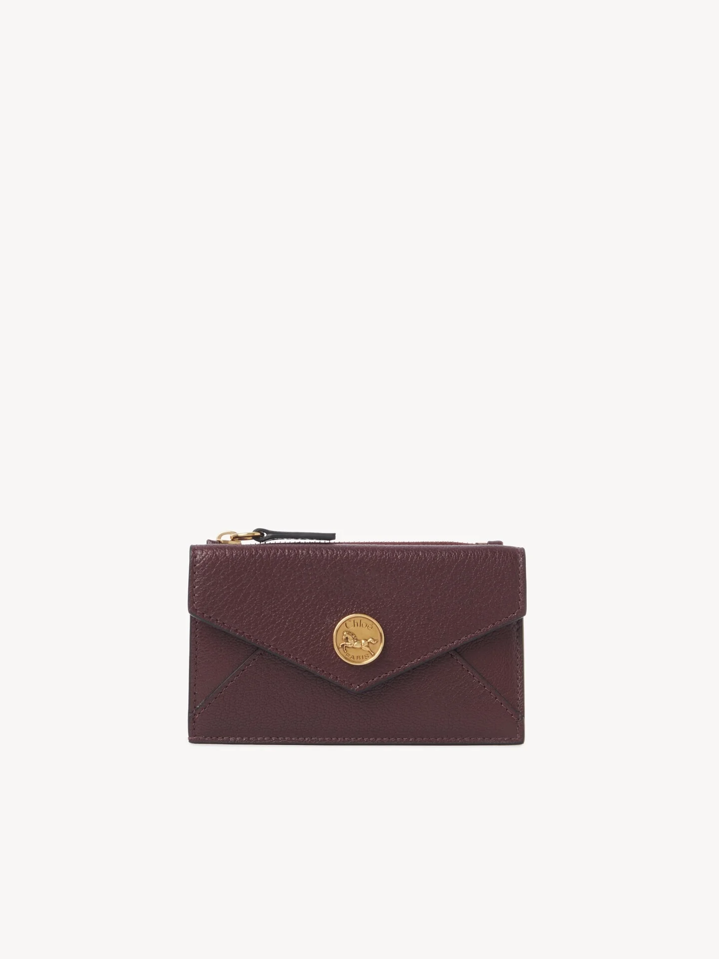DESCRIPTION Crafted from grained goatskin, this Envelope small purse combines a zipped main compartment and coin pocket with four card slots. The elongated design is finished with the Maison's golden Horse Medal in a nod to the equestrian world. PRODUCT DETAILS Envelope small purse with card slots in grained goatskin Main lining: Calfskin Inner lining: 65% Polyester, 35% Cotton - 1 coin pocket - 1 main compartment - 4 card slots - 1 flat pocket - Zipped & snap button closure Comes with a dust bag - Width: 5.1" (13 cm) - Height: 3.1" (8 cm) To make this product, Chloe worked with Leather Working Group (LWG) certified leather manufacturers. LWG certifies tanneries based on their water and energy usage, management of chemicals, solid waste, and wastewater. Color: Grenat Item code: CH25SP538O93602 CARE INSTRUCTIONS In order to protect this article, we recommend that you: avoid rubbing against abrasive materials shield it from humidity, light and heat avoid contact with liquids and greasy substances (makeup, cream) store your product carefully in its dustcover when not in use avoid rubbing against color-contrasting clothes or materials. To remove a water stain, gently soak up liquid by dabbing it with a white cloth should a scratch occur on the leather, you can gently massage it with the same type of cloth for all other issues, please contact the Chloe after-sales service or a specialist. TRACEABILITY Better traceability is central to improving our materials as well as social and environmental practices. Dyeing: Italy Finishing: Italy Tanning: Italy