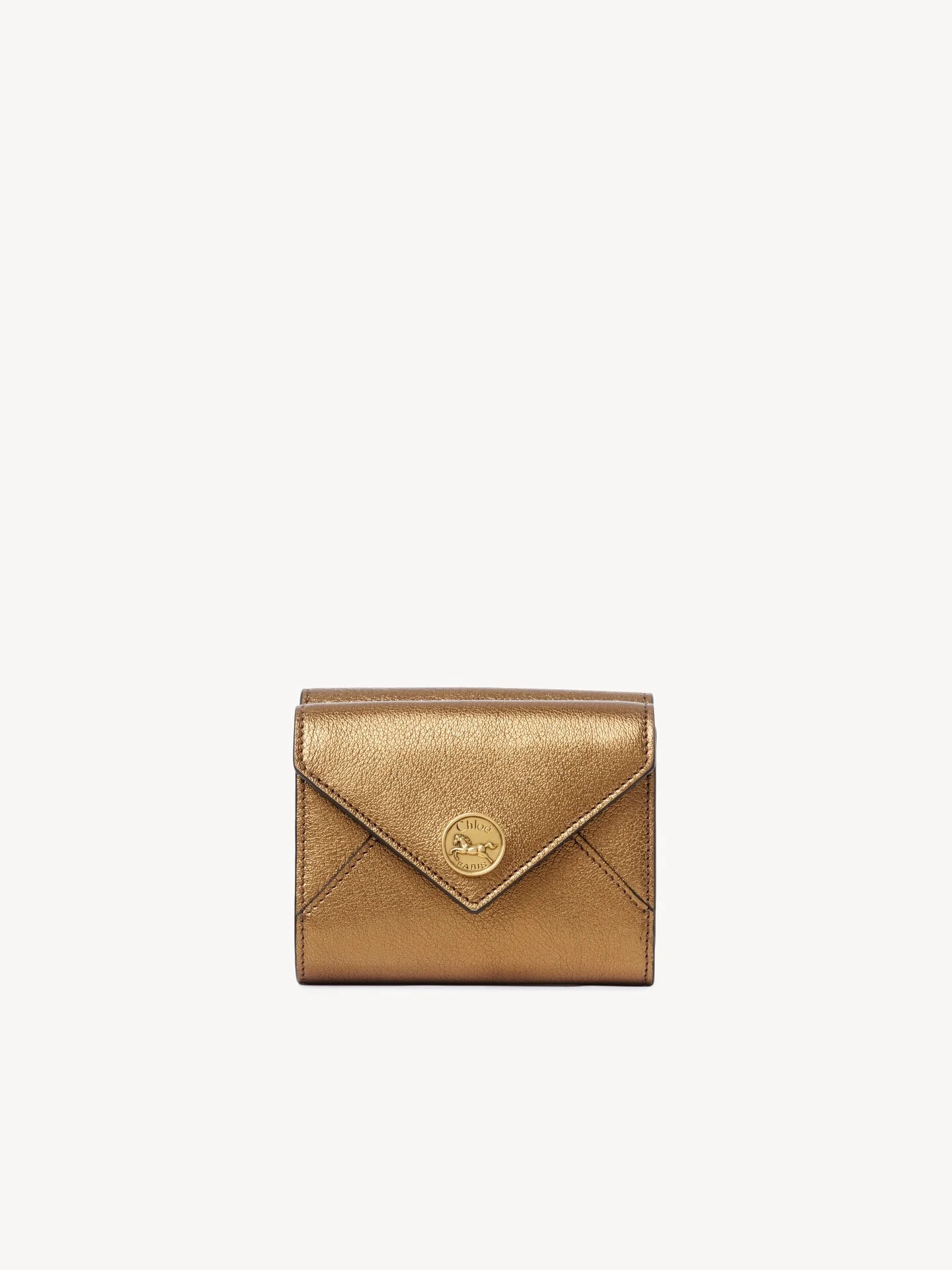 DESCRIPTION Crafted from metallized buffalo leather, the small Envelope tri-fold wallet features a bill compartment, a coin pocket and six card slots. This small wallet is finished with the Maison's golden Horse Medal in a nod to the equestrian world. PRODUCT DETAILS Small Envelope tri-fold wallet in metallized buffalo leather Main lining: Calfskin Inner lining: 65% Polyester, 35% Cotton - 6 card slots - 1 bill compartment - 1 coin pocket - Snap button closure Comes with a dust bag - Width: 7.9" (11 cm) - Height: 3.9" (10 cm) To make this product, Chloe worked with Leather Working Group (LWG) certified leather manufacturers. LWG certifies tanneries based on their water and energy usage, management of chemicals, solid waste, and wastewater. Color: Golden Brown Item code: CH26SP543R1820Y CARE INSTRUCTIONS In order to protect this article, we recommend that you: avoid rubbing against abrasive materials shield it from humidity, light and heat avoid contact with liquids and greasy substances (makeup, cream) store your product carefully in its dustcover when not in use avoid rubbing against color-contrasting clothes or materials. To remove a water stain, gently soak up liquid by dabbing it with a white cloth should a scratch occur on the leather, you can gently massage it with the same type of cloth for all other issues, please contact the Chloe after-sales service or a specialist.
