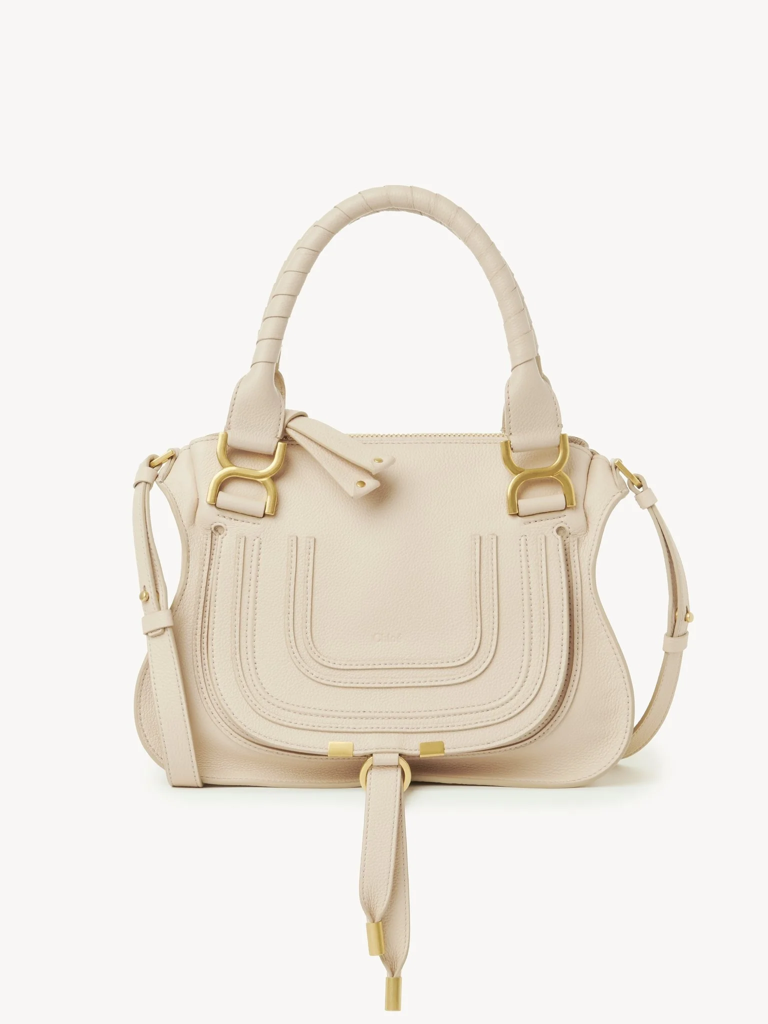 Crafted from grained calfskin, this small Marcie purse has a slouchy silhouette with feminine lines. It is finished with saddle stitching, iconic gold-tone buckles and hand-wrapped double handles. The line's dangling leather tassels secure the flap. Carry this leather bag in the hand, on the shoulder or crossbody with the handles or strap. PRODUCT DETAILS Small shoulder bag in grained calfskin Main material: Calfskin Main lining: 68% Linen, 32% Cotton Flap lining: Calfskin Carry: Hand, shoulder & crossbody - Roomy compartment - Zipped closure - Front slip pocket hidden by the flap - 1 internal zipped pocket - Removable leather strap attached with hooks Comes with a dust bag - Width: 11.8" (30 cm - Height: 9.1" (23 cm) - Depth: 3.5" (9 cm) - Strap drop: 20.1" (51 cm) To make this product, Chloe worked with Leather Working Group (LWG) certified leather manufacturers. LWG certifies tanneries based on their water and energy usage, management of chemicals, solid waste, and wastewater. Color: Sweet Beige Item code: CHC22AS628I3124Q