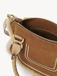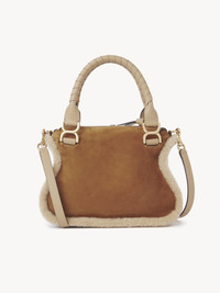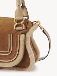 Crafted from suede calfskin with shearling trims, this small Marcie double carry bag has a slouchy silhouette with feminine lines. It is finished with saddle stitching, gold-tone buckles and hand-wrapped double handles. The line's dangling leather tassels secure the flap. Carry this small bag in the hand, on the shoulder or crossbody with the handles or strap. PRODUCT DETAILS Small Marcie double carry bag in suede calfskin & shearling Main material: Suede calfskin Secondary material: Calfskin Main lining: Calfskin Flap lining: Calfskin Carry: Hand, shoulder & crossbody - Roomy compartment - Zip closure - Front slip pocket hidden by the flap - 1 internal zipped pocket - Removable leather strap attached with hooks Comes with a dust bag - Width: 11.8" (30 cm) - Height: 9.1" (23 cm) - Depth: 3.5" (9 cm) - Strap drop: 20.1" (51 cm) To make this product, Chloe worked with Leather Working Group (LWG) certified leather manufacturers. LWG certifies tanneries based on their water and energy usage, management of chemicals, solid waste, and wastewater. Color: Summery Beige Item code: CH25WS628Q4524M