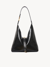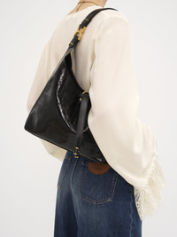This small Marcie hobo bag has a slouchy, minimalist silhouette. Crafted from shiny calfskin with an embossed crocodile effect, it features a studded handle embellished with the line's iconic gold-tone metallic piece. Signature leather tassels secure its calfskin interior. Wear this leather bag on the shoulder. PRODUCT DETAILS Small hobo bag in croco-effect calfskin Main material: Calfskin Secondary material: Calfskin Main lining: Split calfskin Carry: Shoulder - 1 main compartment - 1 inside zippered pocket - Tassel closure Comes with a dust bag - Width: 11.4" (29 cm) - Height: 8.5" (21.5 cm) - Depth: 3.7" (9.5 cm) - Handle drop: 10.2" (26 cm) This purse is made from semi-aniline leather. The half-transparent finish imparts a robust nature to the product while preserving its natural character. Follow all care instructions on the insert. To make this product, Chloe worked with Leather Working Group (LWG) certified leather manufacturers. LWG certifies tanneries based on their water and energy usage, management of chemicals, solid waste, and wastewater. Color: Black Item code: CHC24WS629O24001