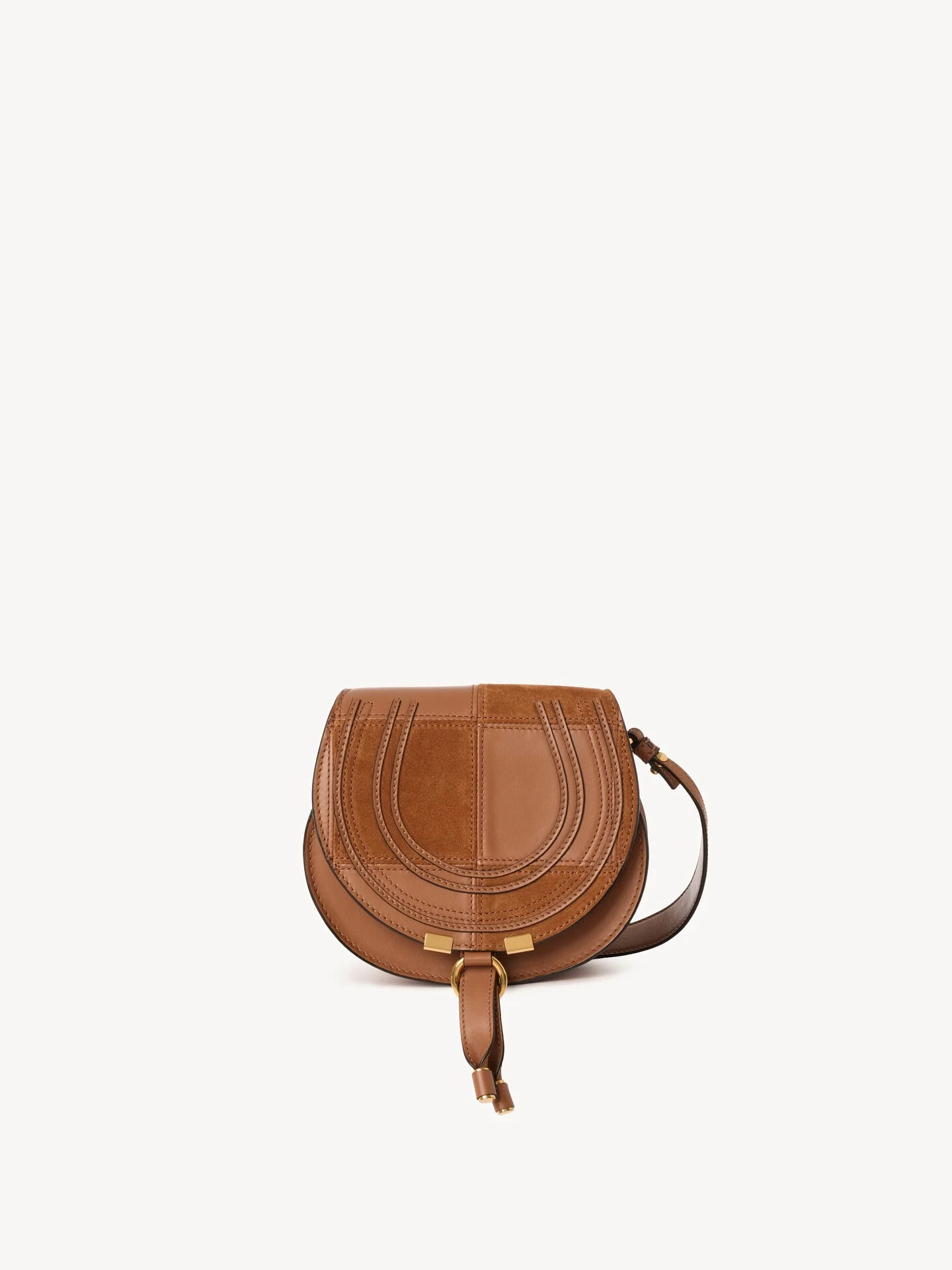 DESCRIPTION This small Marcie saddle bag is crafted from a patchwork of grained buffalo leather and suede calfskin, with a rounded silhouette and a clean top line. The flap features the line's iconic saddle stitching and is secured with signature dangling leather tassels. This leather bag comes with a strap for shoulder or crossbody carry. PRODUCT DETAILS Small Marcie saddle bag in grained buffalo leather & suede calfskin Main material: Buffalo leather Secondary material: Calfskin Main lining: Calfskin Carry: Shoulder & crossbody - 1 roomy compartment - 1 front slip pocket - 1 inside flat card pocket - 1 adjustable leather strap - Tassel closure Comes with a dust bag - Width: 7.5" (19 cm) - Height: 6.7" (17 cm) - Depth: 3.9" (10 cm) - Min. strap drop: 20.5" (52 cm) - Max. strap drop: 24.4" (62 cm) Color: Dusty Tan Item code: CH26SS930R0425S TRACEABILITY Better traceability is central to improving our materials as well as social and environmental practices. Dyeing: Italy Finishing: Italy Tanning: Italy Manufacturing : Italy