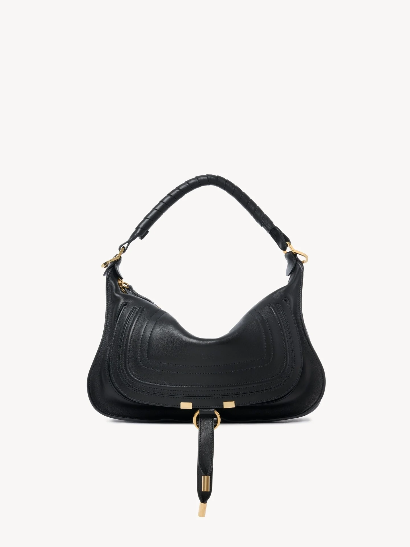 DESCRIPTION Crafted from smooth calfskin, this small Marcie shoulder bag reinterprets the line's iconic day bag with a slouchier silhouette. Saddle stitching, a single hand-wrapped handle and gold-tone hardware finish the updated design. The line's dangling leather tassels secure the flap. Carry this leather bag in the hand or on the shoulder, or crossbody with the adjustable leather strap. PRODUCT DETAILS Small Marcie shoulder bag in smooth calfskin Main material: Calfskin Secondary material: Calfskin Main lining: 68% Linen, 32% Cotton Carry: Hand, shoulder & crossbody - 1 main compartment - 1 front slip pocket hidden by the flap - 1 internal flat pocket - 1 adjustable & removable leather strap - Zip closure Comes with a dust bag - Width: 13.4" (34 cm) - Height: 7.9" (20 cm) - Depth: 3.3" (8.5 cm) - Handle drop: 7.9" (20 cm) - Min. strap drop: 17.7" (45 cm) - Max. strap drop: 23.2" (59 cm) Color: Black Item code: CH26SS882R35001 CARE INSTRUCTIONS In order to protect this article, we recommend that you: avoid overloading your bag avoid rubbing against abrasive materials shield it from humidity, light and heat avoid contact with liquids and greasy substances (makeup, cream) store your bag carefully in its dustcover when not in use avoid rubbing against color-contrasting clothes or materials to remove a water stain, gently soak up liquid by dabbing it with a white cloth should a scratch occur on the leather, you can gently massage it with the same type of cloth for all other issues, please contact the Chloe after-sales service or a specialist. TRACEABILITY Better traceability is central to improving our materials as well as social and environmental practices. Dyeing: Italy Finishing: Italy Tanning: Italy