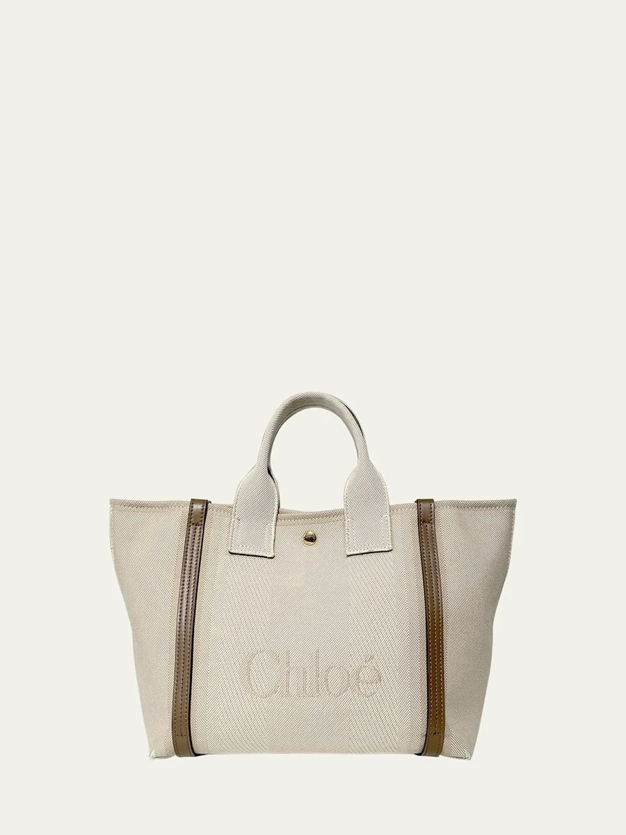 Chloe tote bag in jacquard canvas cotton, polyester, and leather Top handles Removable crossbody strap Can be worn as a top handle or crossbody bag Open top with snap closure Interior, one slip pocket Approx. 7.9"H x 10.4"W x 3.1"D Professional cleaning recommended Made in Italy