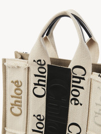 Updated with a disruptive twist, this small Woody tote bag combines linen with multiple vertical strips embroidered with the signature Chloé logo, along with a logo-embossed leather patch. The day-to-evening bag includes a long, removable strap in addition to the top handles. The roomy inside compartment includes a practical flat pocket, while linen lining matches a refined finish with a lower environmental impact. Carry this versatile small purse on the arm, shoulder or cross-body. All about Woody... The Woody line is characterized by the signature Chloé logo carried over from the Maison's iconic mules. It showcases a modern, minimalist silhouette ranging from nano to large sizes. PRODUCT DETAILS Tote bag in linen with Chloé logo multi-embroidered webbing & calfskin Carry: shoulder, arm & cross-body - 2 short handles - Removable & adjustable long strap - 1 spacious main compartment - 1 internal flat pocket - Linen lining Comes with a dust bag - Width: 10.4" (26.5 cm) - Height: 7.9" (20 cm) - Depth: 3.1" (8 cm) - Handle drop: 4.3" (11 cm) - Strap drop: 20.5" (52 cm) This small purse is made from linen. In an effort to limit its environmental impact and have a positive influence on society, Chloé is accelerating its transition to more responsible sourcing. This progress is most notably reflected in the introduction of linen – an inherently lower-impact material – to the collection. Respect care instructions on the leaflet. Color: Sand Item code: CHC23SS369J7220H