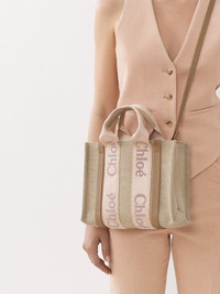 Crafted from linen canvas detailed with shiny calfskin strips, this small Woody tote bag is a soft day bag with a long, removable strap in addition to the top handles. The roomy inside compartment includes a practical flat pocket in leather for an elevated touch. Linen lining matches a refined finish with a lower environmental impact. Carry this versatile small purse on the arm, shoulder or cross-body. All about Woody... The Woody line is characterized by the signature Chloé logo carried over from the Maison's iconic mules. It showcases a modern, minimalist silhouette ranging from nano to large sizes. PRODUCT DETAILS Tote bag in linen canvas, calfskin and webbing with Chloé logo embroidery Main material: Linen Secondary material: Calfskin Main lining: Linen Handle: 90% Linen, 10% Polyester Carry: Shoulder, arm & cross-body - 2 short handles - Removable & adjustable long strap - 1 spacious main compartment - 1 internal flat pocket Comes with a dust bag - Width: 10.4" (26.5 cm) - Height: 7.9" (20 cm) - Depth: 3.1" (8 cm) - Handle drop: 4.3" (11 cm) - Strap drop: 20.5" (52 cm) This small purse is made from a woven fabrication adapted to leather goods requirements. A water-repellent treatment was applied to the fabric, but rain exposure should be avoided. Avoid rubbing this material against color-contrasting materials and shield it from humidity, light, heat, liquids and greasy substances. Follow all care instructions on the insert. Linen, hemp and ramie cultivations emit less greenhouse gases and require less water compared to other conventional natural fibers, which is why they are considered lower-impact materials by nature. Color: Blushy Beige Item code: CHC23AS397L1726Y