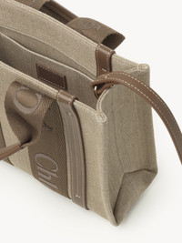 This small Woody tote bag is crafted from linen canvas and shiny calfskin for a summer attitude. A practical day bag, it features a roomy compartment, top handles and a long, removable strap for multiple carry options. The bag's modern lines are emphasized by contrasting vertical leather strips and the signature Chloé logo embroidery. All about Woody... The Woody line is characterized by the signature Chloé logo carried over from the Maison's iconic mules. Modern and minimalist, it comes in nano to large sizes. PRODUCT DETAILS Tote bag in linen canvas, calfskin and webbing with Chloé logo embroidery Main material: Linen Secondary material: Calfskin Main lining: 68% Linen, 32% Cotton Handle: 90% Linen, 10% Polyester Carry: Shoulder, arm & cross-body - 2 short handles - Removable & adjustable long strap - 1 spacious main compartment - 1 internal flat pocket Comes with a dust bag - Width: 10.4" (26.5 cm) - Height: 7.9" (20 cm) - Depth: 3.1" (8 cm) - Handle drop: 4.3" (11 cm) - Min. strap drop: 20.5" (52 cm) - Max. strap drop: 22" (56 cm) This small bag is made from a woven fabrication adapted to leather goods requirements. A water-repellent treatment was applied to the fabric, but rain exposure should be avoided. Avoid rubbing this material against color-contrasting materials and shield it from humidity, light, heat, liquids and greasy substances. Follow all care instructions on the insert. Linen, hemp and ramie cultivations emit less greenhouse gases and require less water compared to other conventional natural fibers, which is why they are considered lower-impact materials by nature. Color: Dark Nut Item code: CHC23AS397L1729X