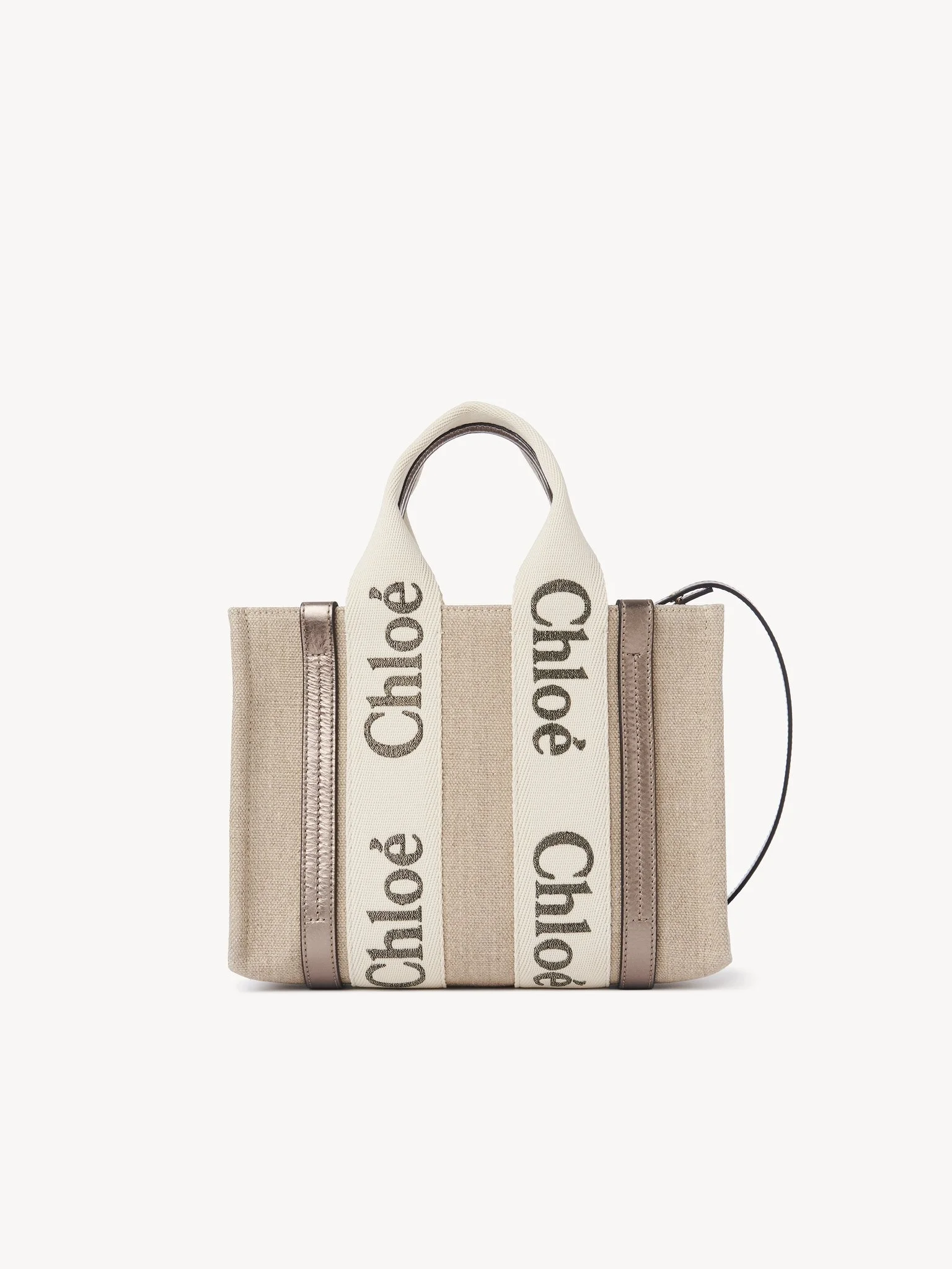 This small Woody tote bag is crafted from linen canvas, elevated by contrasting vertical strips in shiny calfskin and signature canvas ribbons embroidered with the Chloe logo. Carry in the hand with the double handles, or on the shoulder or crossbody with the removable strap. PRODUCT DETAILS Small tote bag in linen canvas, metallized calfskin and webbing with Chloe logo embroidery Main material: Linen Secondary material: Calfskin Main lining: 68% Linen, 32% Cotton Trimming: Polyester Carry: Hand, shoulder & cross-body - 2 short handles - Removable & adjustable long strap - 1 main compartment - 1 inside flat pocket Comes with a dust bag - Width: 10.4" (26.5 cm) - Height: 7.9" (20 cm) - Depth: 3.1" (8 cm) - Handle drop: 4.3" (11 cm) - Min. strap drop: 20.5" (52 cm) - Max. strap drop: 22" (56 cm) This tote bag is made from a woven fabrication adapted to leather goods requirements. A water-repellent treatment was applied to the fabric, but rain exposure should be avoided. Avoid rubbing this material against color-contrasting materials and shield it from humidity, light, heat, liquids and greasy substances. Follow all care instructions on the insert. Linen, hemp and ramie cultivations emit fewer greenhouse gases and require less water compared to other conventional natural fibers, which is why they are considered lower-impact materials by nature. Color: Shiny Gray Item code: CHC25SS397O81074
