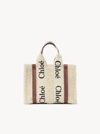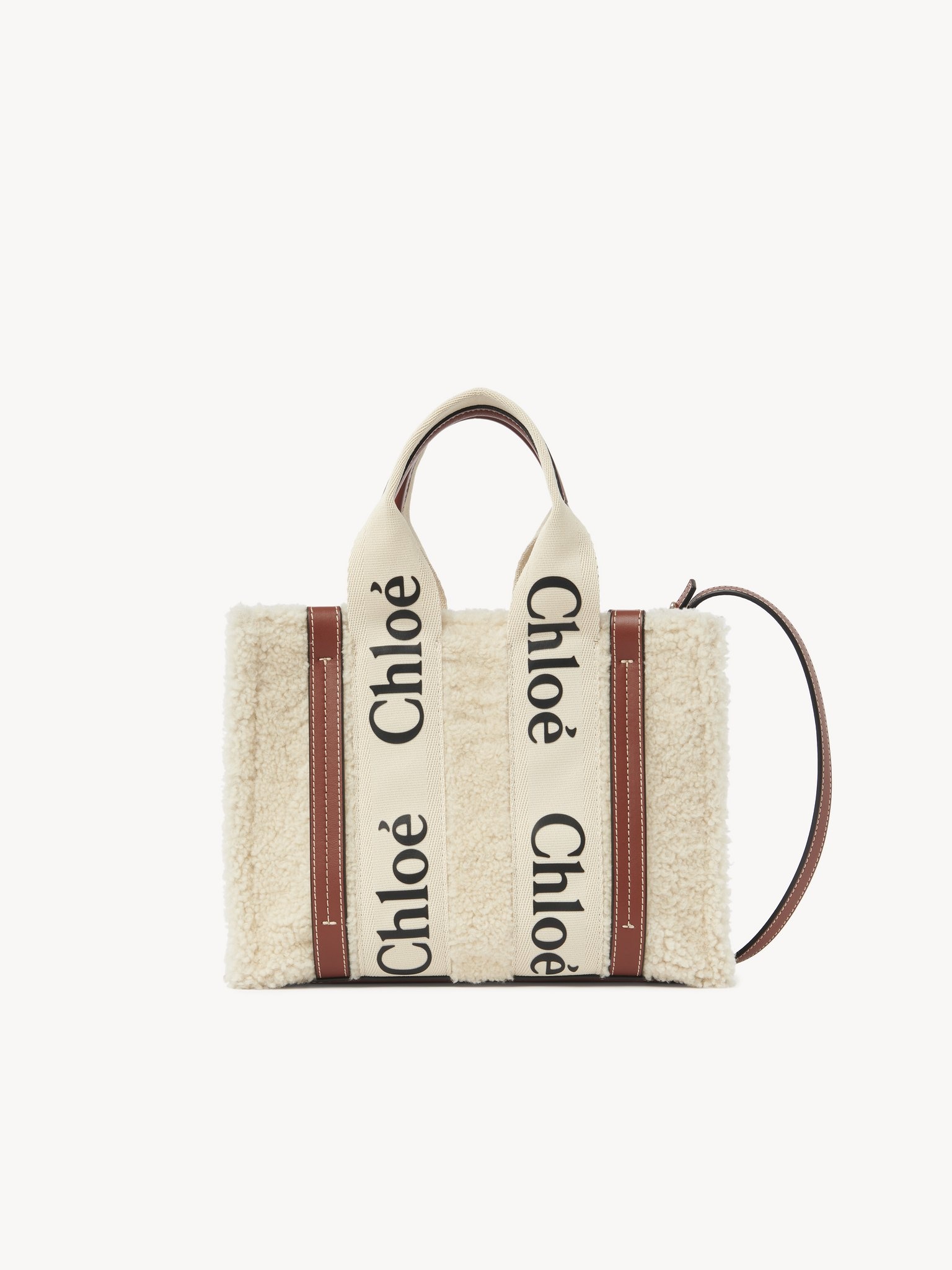 Crafted from luxurious shearling, this small Woody tote bag is a compact day-to-evening bag with a long, removable strap and a winter attitude. The roomy inside compartment includes a practical flat pocket. The bag's sharp, modern lines are emphasized by the contrasting vertical leather strips and the signature Chloé logo ribbon carried over from the Maison's Woody mule. Carry this versatile small purse on the arm, shoulder or cross-body. PRODUCT DETAILS Tote bag in shearling & shiny calfskin with Woody ribbon Carry: shoulder, arm, cross-body - 2 short handles - Removable & adjustable long strap - 1 spacious main compartment - 1 internal flat pocket Comes with a dust bag - Width: 10.4" (26.5 cm) - Height: 7.9" (20 cm) - Depth: 3.1" (8 cm) - Handle drop: 4.3" (11 cm) - Strap drop: 21.7” (55 cm) This handbag is made from fur or hide with its natural coat. This highly sophisticated product may lose hair in areas subject to repeated rubbing. This material requires special care. Avoid overloading your bag and rubbing it against color-contrasting clothes or materials. Color: Mild Beige Item code: CHC21WS397F586J1