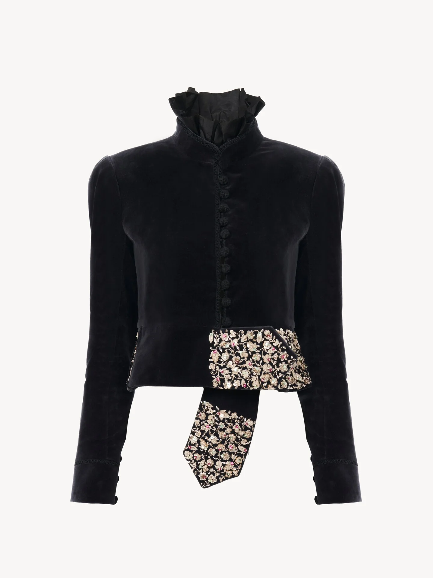 DESCRIPTION High-neck fitted Spencer jacket in soft cotton velvet, featuring a jewelry-embroidered belt, a ruffled silk collar and braided buttons with loop closures. PRODUCT DETAILS Fitted Spencer jacket outer shell: 100% Cotton Lining: 51% Viscose, 49% Cotton Piping: 84% Viscose, 16% Cotton Main embellishment: 70% Copper, 20% Polyethylene, 10% Polyester Collar: 100% Silk Fit: fitted - The model is 5'10" (178 cm) and wears a prototype in size 36 - Fitted velvet jacket - Braided buttons with loop closure at front & cuffs - Embroidered belt Color: Ash Black Item code: CH25WVE81091070 CARE INSTRUCTIONS To preserve the integrity of your garment, please refrain from washing, entrusting its care to professional cleaning services for optimal maintenance. This garment cannot withstand any bleaching agent. To maintain its shape, gently iron this garment at a maximum sole plate temperature of 110°C, taking care to avoid any harsh pressure while ironing. Entrust this garment to a specialist for mild cleaning with tetrachloroethylene and solvent F, ensuring its delicate nature is maintained with the most care. To maintain its delicate nature, do not wet clean this garment. To best preserve its form and texture, please do not tumble dry this garment. TRACEABILITY Better traceability is central to improving our materials as well as social and environmental practices. Dyeing: Italy Finishing: Italy Weaving: Italy