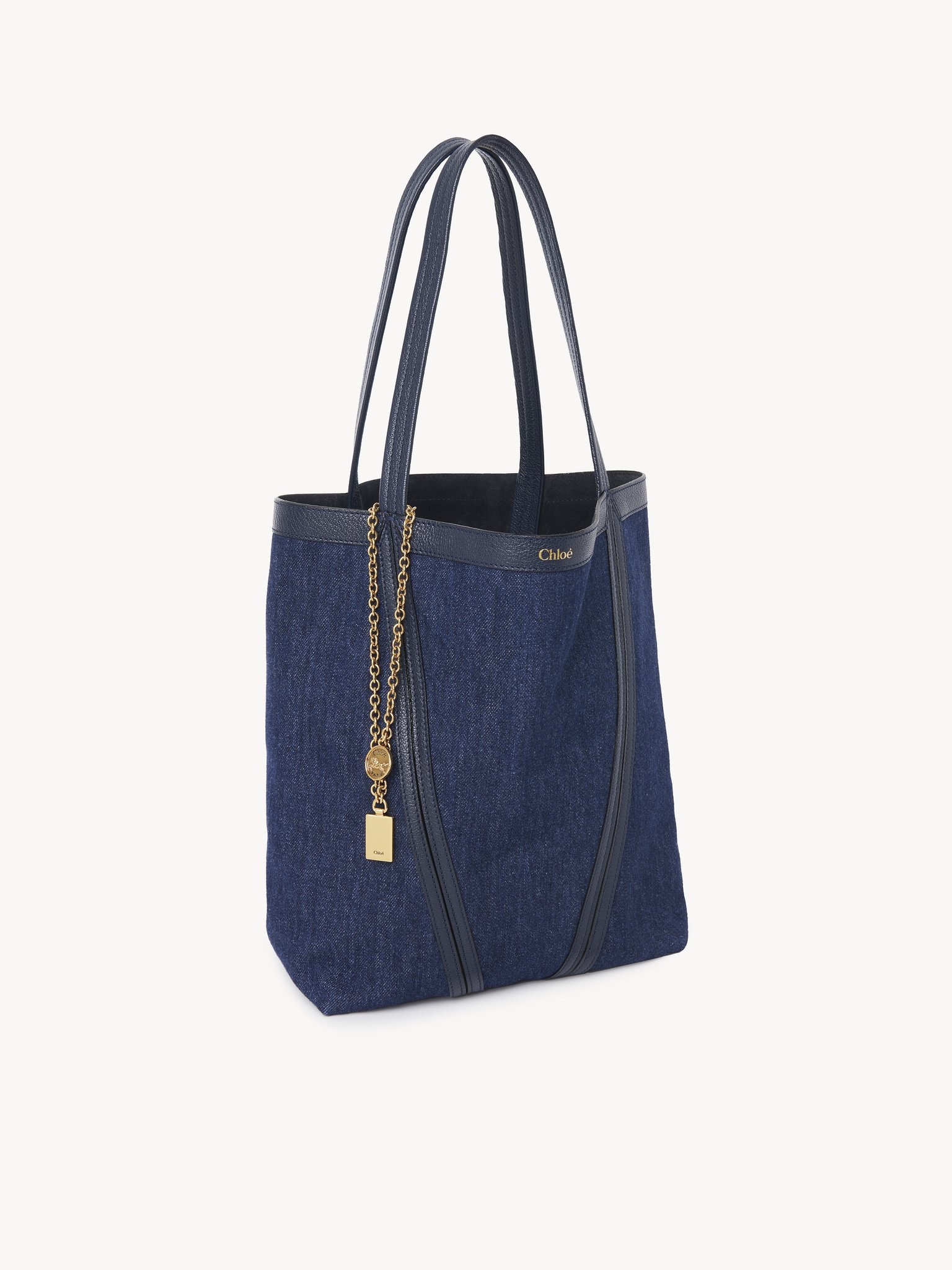 Crafted from denim and calfskin, the Chloe Spin tote bag has a minimalist silhouette elevated with graphic lines. A dangling chain features the Maison's signature Chloe and Horse Medals. Wear on the shoulder or slide the handles through the ring for hand carry. PRODUCT DETAILS Chloe Spin tote bag in denim & calfskin Main material: Cotton Secondary material: Cowhide Main lining: Calfskin Carry: Hand & shoulder - 1 main compartment Comes with a dust bag - Width: 10.6" (27 cm) - Height: 11.8" (30 cm) - Depth: 5.5" (14 cm) - Handle drop: 9.1" (23 cm) To make this product, Chloe worked with Leather Working Group (LWG) certified leather manufacturers. LWG certifies tanneries based on their water and energy usage, management of chemicals, solid waste, and wastewater. Color: Submarine Blue Item code: CH25AS811P98408
