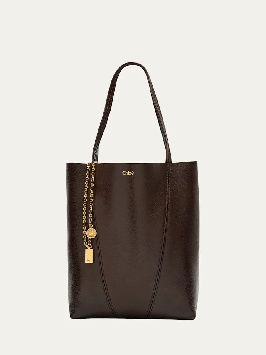 Chloe "Spin" tote bag in shinygrained leather Shoulder straps with charm chain strap Open top Lining: Leather Approx. 11.8"H x 10.6"W x 5.5"D Professional cleaning recommended Made in Italy