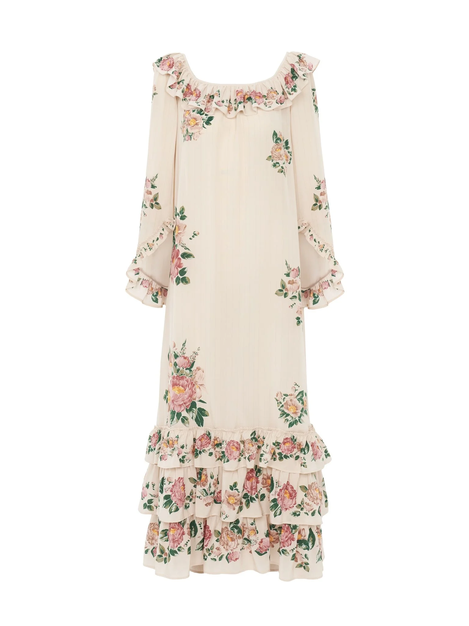 Square-neck long dress in striped floral organic silk crepe de chine with a silk-mix lining, featuring maxi sleeves and ruffle trims at the neckline, cuffs and tiered hem. PRODUCT DETAILS Long dress outer shell: 100% Silk Lining: 68% Acetate fiber, 32% Silk Fit: fluid, long - The model is 5'10" (178 cm) and wears a prototype in size 36 - Long ruffle dress - Slips on Organic silk manufacturing restricts the use of pesticides, insecticides or harsh chemicals and incorporates methods that respect biodiversity, improve soil quality and reduce water consumption. This product was made by Marie Helene Couture, a long-standing partner of Chloe based in Morlaas, France. Marie Helene Couture excels in the specialized technique of couture "flou." Their expertise aligns with the rigorous standards set by the "metiers de la mode, vetement flou" certification, ensuring a high level of professional aptitude in this delicate and skilled art form. Color: Coconut Milk Item code: CH25ARO09718103