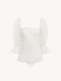 Square-neck top in lace embroidery rooted in the Maison's heritage. Puff sleeves, fabric-covered buttons, lace trims and a silk-mix lining detail this piece. PRODUCT DETAILS Square-neck top outer shell: 100% Polyester Main embroidery: 70% Polyester, 24% Viscose, 6% Polyamide Secondary embroidery: 73% Polyester, 21% Viscose, 6% Polyamide Sleeves: 100% Polyamide Lining: 68% Acetate fiber, 32% Silk Fit: fluid - The model is 5'10" (178 cm) and wears a prototype in size 36 - White lace top - Fabric-covered buttons at left side Care: dry cleaning only Color: Whisper White Item code: CH25UHT96099113