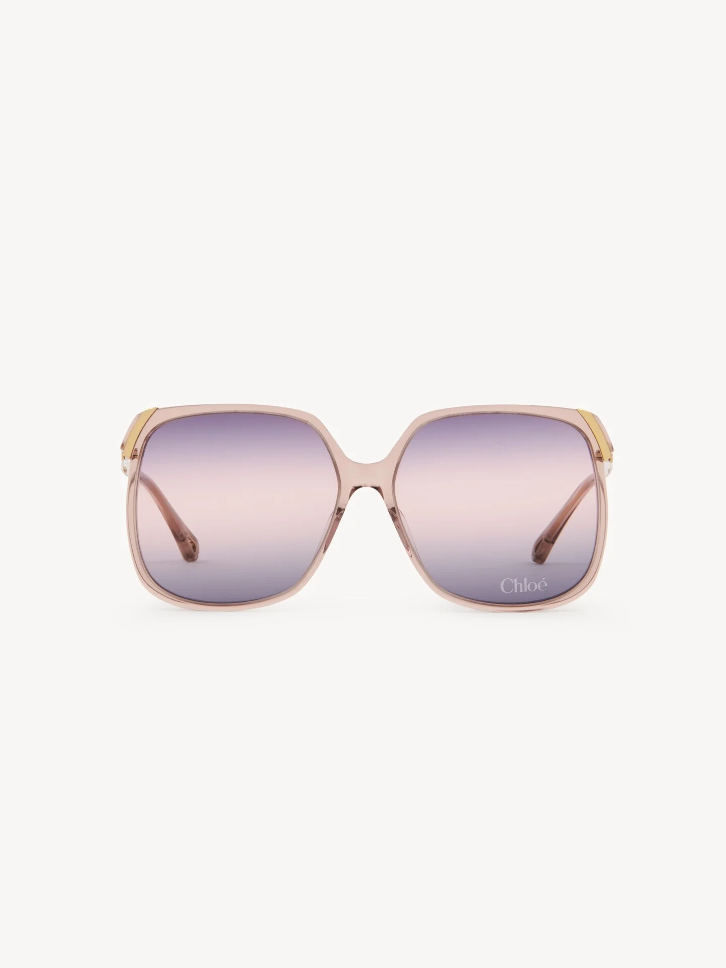 DESCRIPTION These Aly square sunglasses have a 70s-style frame in a mix of transparent light pink lower-impact acetate and shiny gold metal. The triple gradient lenses in violet, light pink and blue are signed with the Chloe logo. Drop-shaped openings at the temple tips make these sunglasses compatible with Chloe's eyewear jewelry. PRODUCT DETAILS Square sunglasses in lower-impact acetate, gold metal & bio-based nylon - 100% UVA and UVB protection - Not prescription friendly - Chloe logo engraved on the temples - Filter category: 1 These sunglasses come with a case and lens cloth - Lens: 2.4" (60 mm) - Bridge: 0.6" (15 mm) - Temple: 5.5" (140 mm) - Transparent light pink lower-impact acetate & gold metal frame - Gradient violet, light pink & blue lenses Item code: CHC25SEK0286615 CARE INSTRUCTIONS These sunglasses/eyeglasses are made with carefully selected materials. Please handle with care for a longer product life.- Store in the case provided.- Clean with a soft, dry cloth.- If necessary, use a damp cloth and mild detergent. Do not use solvents or aggressive detergents which may alter the features of the sunglasses/eyewear