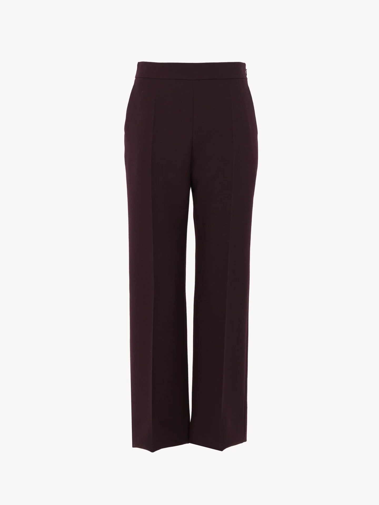 DESCRIPTION Straight cropped pants in lower-impact wool crepe, finished with pressed front creases. PRODUCT DETAILS Cropped pants outer shell: 100% Wool Main lining: 100% Cotton Pocket lining: 51% Viscose, 49% Cotton Fit: cropped - The model is 5'10" (178 cm) and wears a prototype in size 36 - Straight pants - Side hook & zipper fastening - Side pockets - Piped back pockets The wool used in this product comes from a farm that respects animal welfare, maintains soil health, protects biodiversity and promotes native species. This piece was created in collaboration with Chize Confection. A long-standing partner of Chloe, Chize Confection is a Societe Cooperative de Production (SCOP). This cooperative model is distinguished by its democratic governance, fostering a collaborative and democratic working environment. Chloe has signed a contract to financially support Chize Confection with projects that will benefit its employees. Color: Obscure Purple Item code: CH26SPA1706156A CARE INSTRUCTIONS To preserve the integrity of your garment, please refrain from washing, entrusting its care to professional cleaning services for optimal maintenance. This garment cannot withstand any bleaching agent. To maintain its shape, gently iron this garment at a maximum sole plate temperature of 110°C, taking care to avoid any harsh pressure while ironing. Entrust this garment to a specialist for mild cleaning with tetrachloroethylene and solvent F, ensuring its delicate nature is maintained with the most care. To best preserve its form and texture, please do not tumble dry this garment. To maintain its delicate nature, do not wet clean this garment. TRACEABILITY Better traceability is central to improving our materials as well as social and environmental practices. Dyeing: Italy Finishing: Italy Weaving: Italy