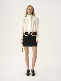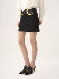 Straight mini skirt in an ornamental wool-mix jacquard with a braided button. PRODUCT DETAILS Mini skirt outer shell: 77% Wool, 23% Polyester Lining: 51% Viscose, 49% Cotton Fit: straight, mini length - The model is 5'10" (178 cm) and wears a prototype in size 36 - Black mini skirt - Side zipper - Braided button at waist Color: Black Item code: CH25WJU03308001